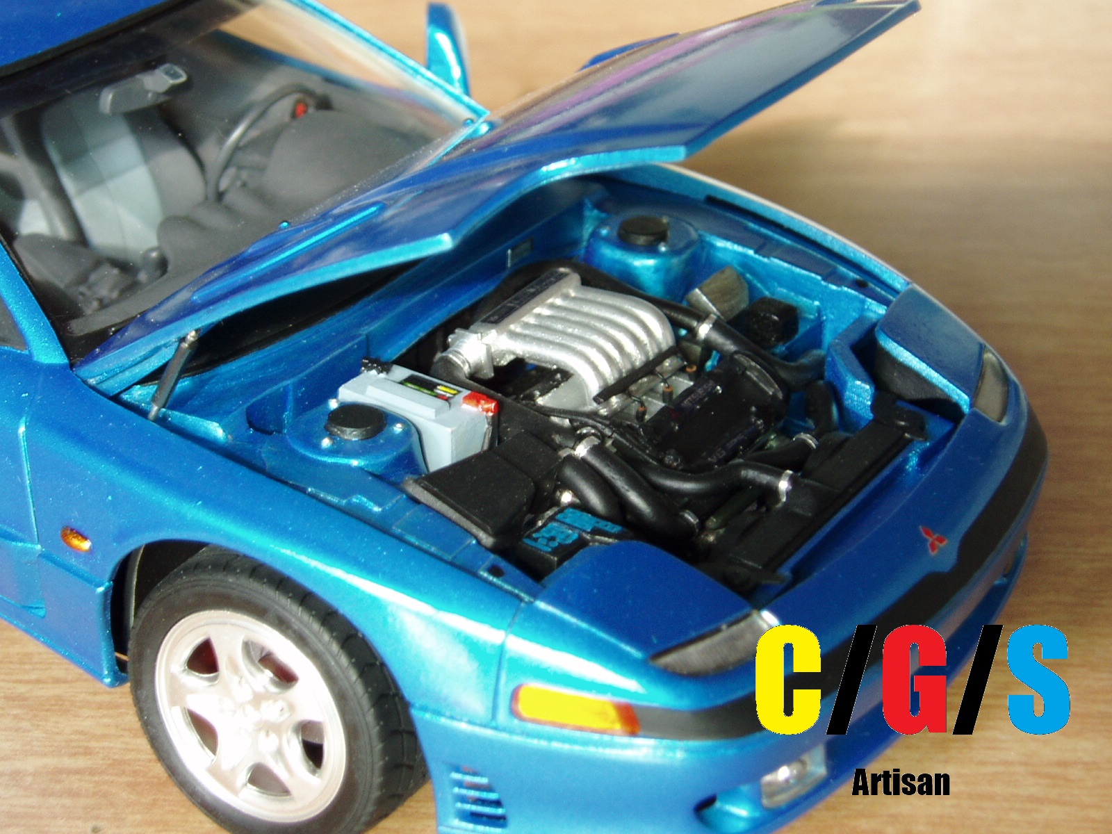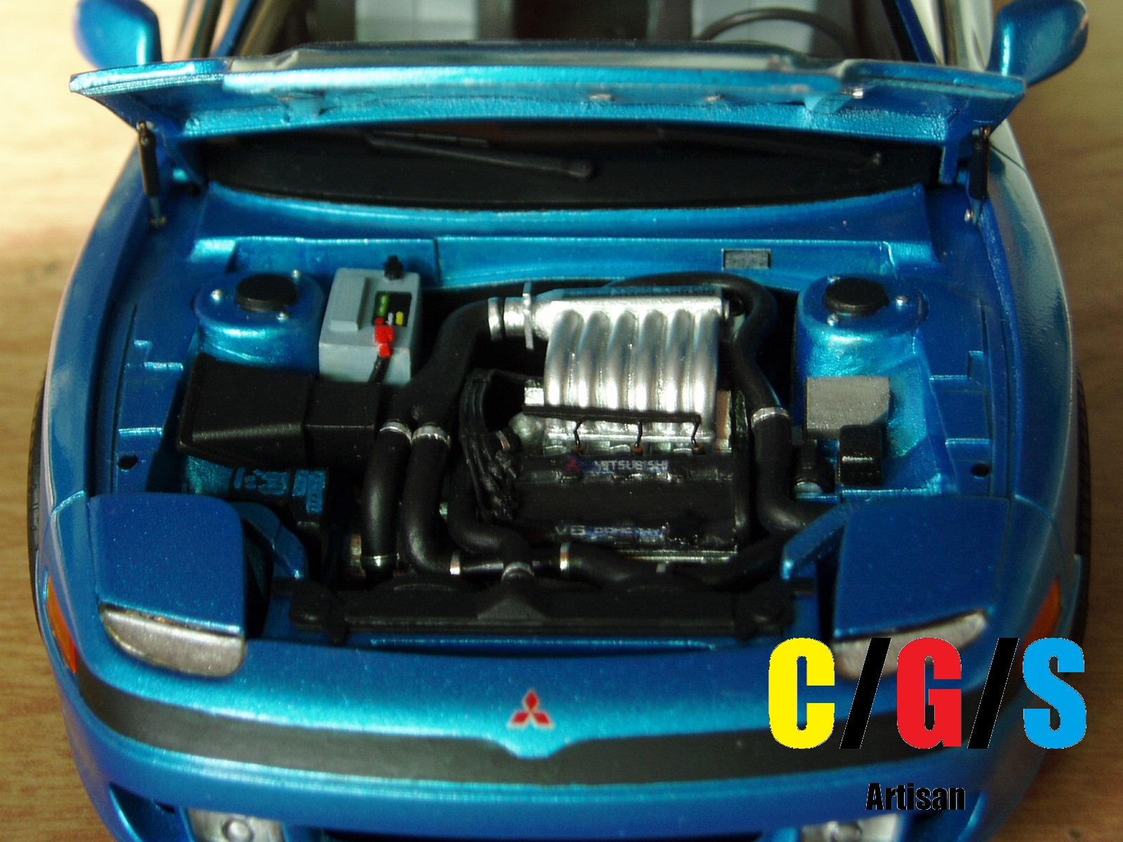 en este caso un modelo de calle, Mitsubishi 3000GT VR4 de Tamiya; este modelo fue algo mas facil debido a que anteriormente monte un Mitsubishi Montero (Tamiya) el cual viene motorizado y en la realidad comparten el block motor, un V6 de 3000 cc. Por ello solo habia que tomar las medidas del original y repetir en lamina de plastico virgen,