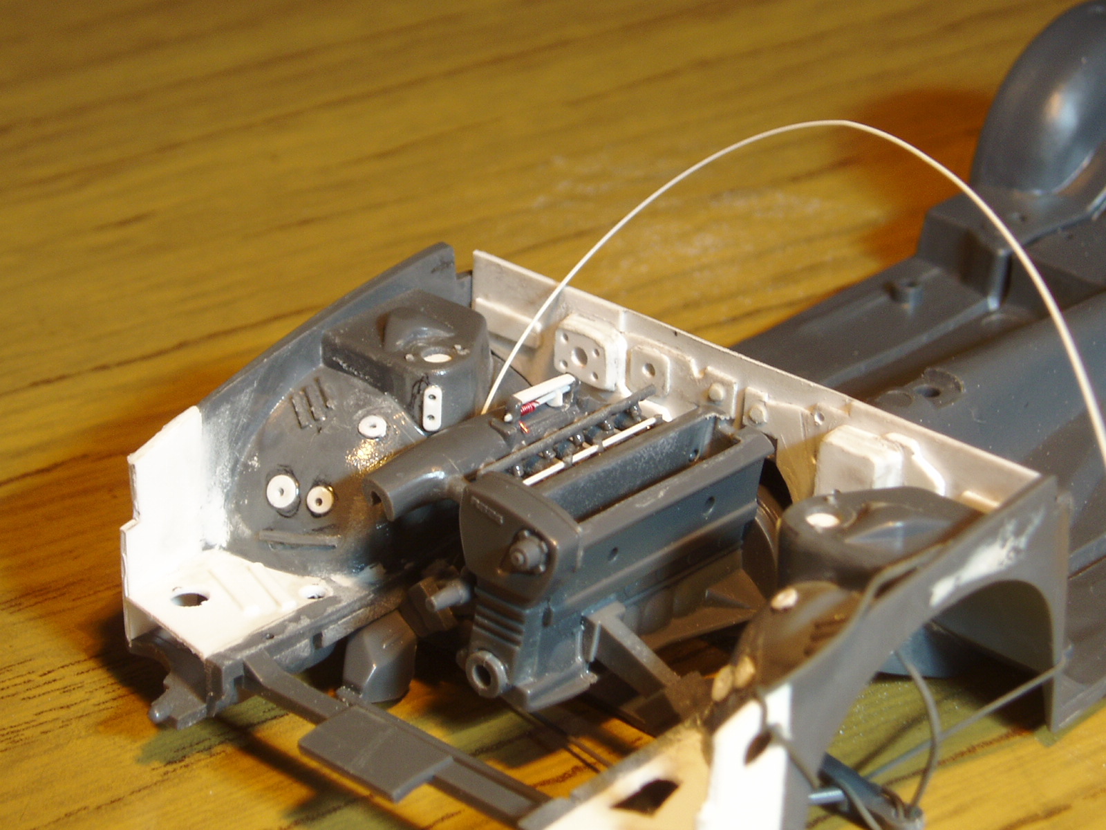 estuve haciendo algunas cosas con el chasis, pegando molduras no muy rebuscadas y haciendo caladuras (lamina de 0.5mm con sacabocados y mecha de 0.5mm, arbol estirado para las costillas sobre los pasaruedas y broca de 3mm)