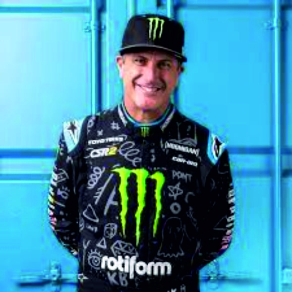 Ken Block como PROTAGONISTA , con un pequeño "continente" encima junto con la PROTAGONISTA