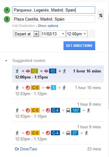 Para que lo tengáis en cuenta, he mirado en Gogle-Maps, lo que se tardaría un domingo de ir desde Parquesur en Leganés hasta la plaza de Castilla, saliendo a las 12:00 del mediodía: