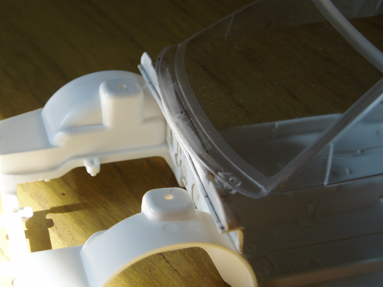 Bueno, despues de trabajar un ratito he llegado a esto, con plastico de alto impacto de 1 mm de espesor trazo el perfil del parabrisas en su cara mas ancha y recorto en forma curva para luego pegar de canto, un poco de lija y masilla y queda asi (en una pocision intermedia entre MM y la real) presentando el parabrisas ahora quedan los laterales y mas detalles del firewall.