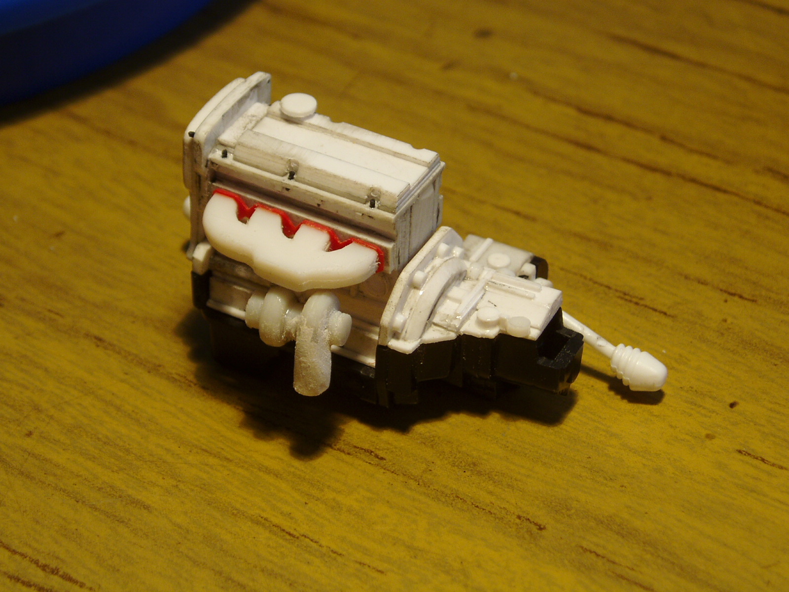 Para realizar el multiple utilice dos rectangulos de plastico de alto impacto de 1mm de espesor pegue ambos rectangulos para obtener mayor volumen y luego dibuje el perfil del multiple una vez recortado y limado... con plastico de tapa de un envase de lacteos (en rojo) realizo el asiento del multiple utilizando un pedazo de arbol de un trailer de camion, mediante el taladro y las limas realizo el turbo pegando las piezas, masilla, lija y presentancion en conjunto, se obtuvo esto Espero que sea de vuestro agrado.
