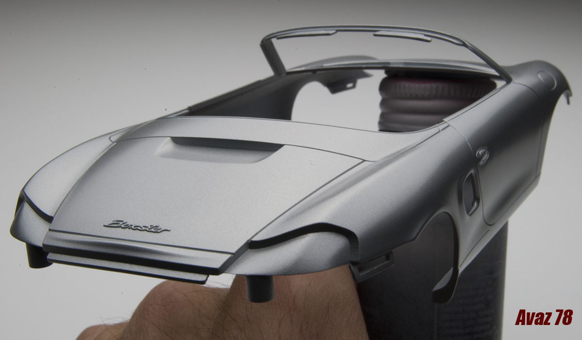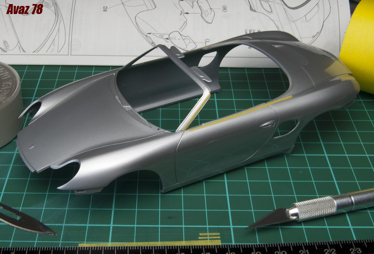 Imprimación gris (en este caso es Mister Surfacer 1200), repasada con lija al agua fina (por ejemplo 1500) Si todo está bien, te puedes ahorrar la capa de negro brillante, que puede llegar a ser muy engorrosa. Unas capas finas, dos o tres, de TS17 de Tamiya, bien diluído con el Lacquer Thinner de la propia marca, el del tapón amarillo (se pueden usar otros, pero este le encuentras fácil). No es la mejor pintura del mundo, pero si queda bien tirada es aceptable: Además, y aquí está el truco, se puede pulir muy suavemente (siempre muy suave, que los pigmentos metálicos se estropean rápido)con un poco de compound (de los de tipo medio, no los gruesos). Así consigues dos cosas: por un lado, eliminas la polvorilla de la propia pintura que te haya podido quedar por encima, y por otro, dejas un acabado ligeramente satinado que te puede permitir poner las calcas directamente encima. Así que ya llevamos dos capas menos de pintura, que al final se nota.