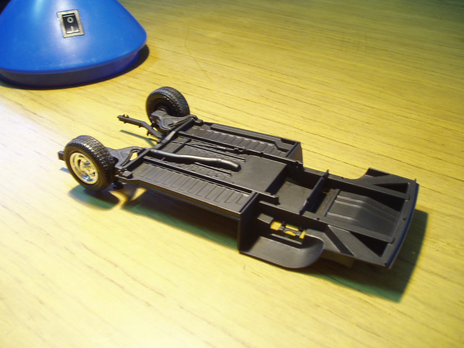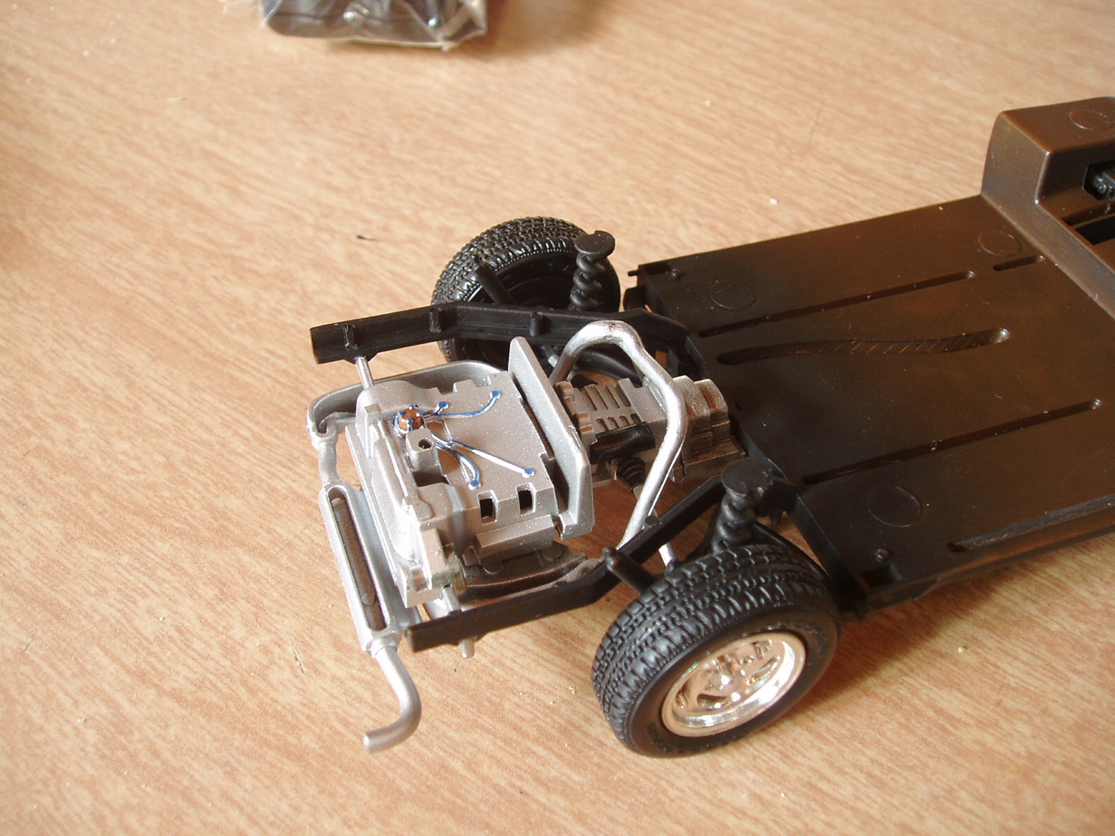 Aqui con el chasis pintado de negro Ensamblamos el motor, lo pintamos y pegamos al chasis, armamos el tren delantero y pegamos Por el momento es todo.