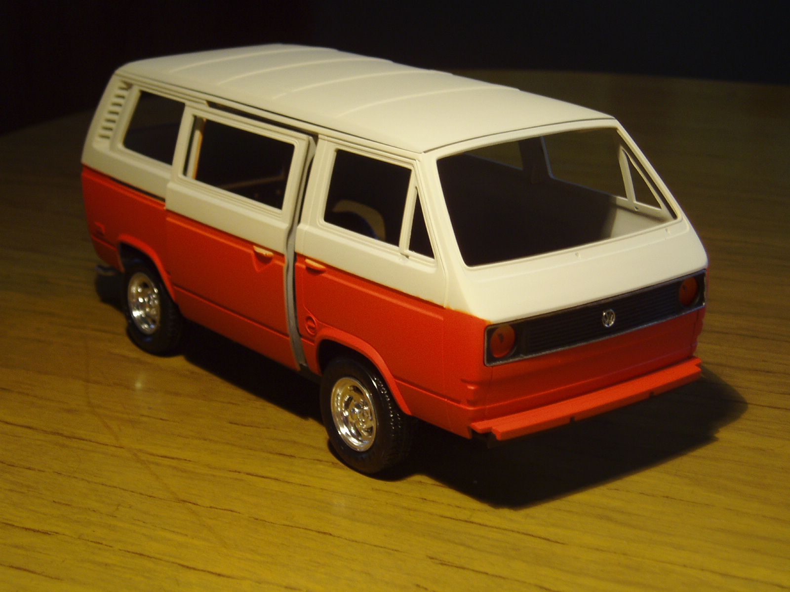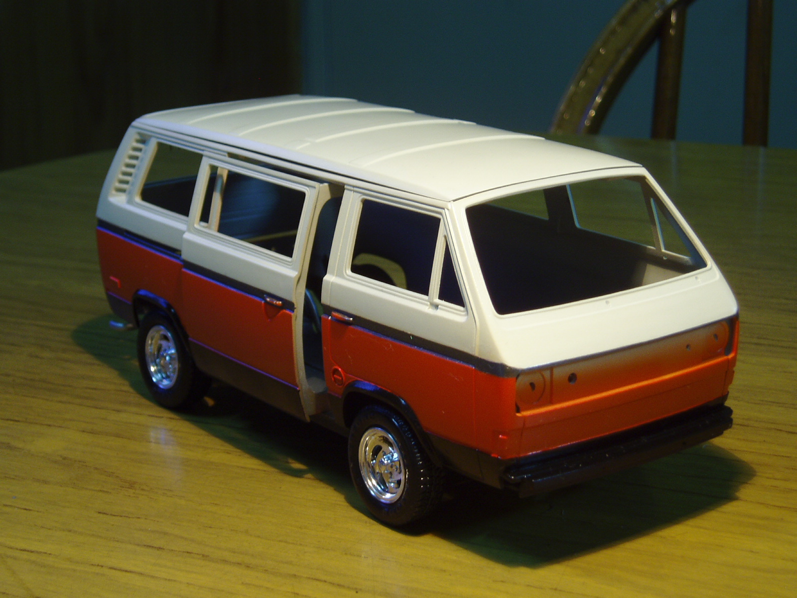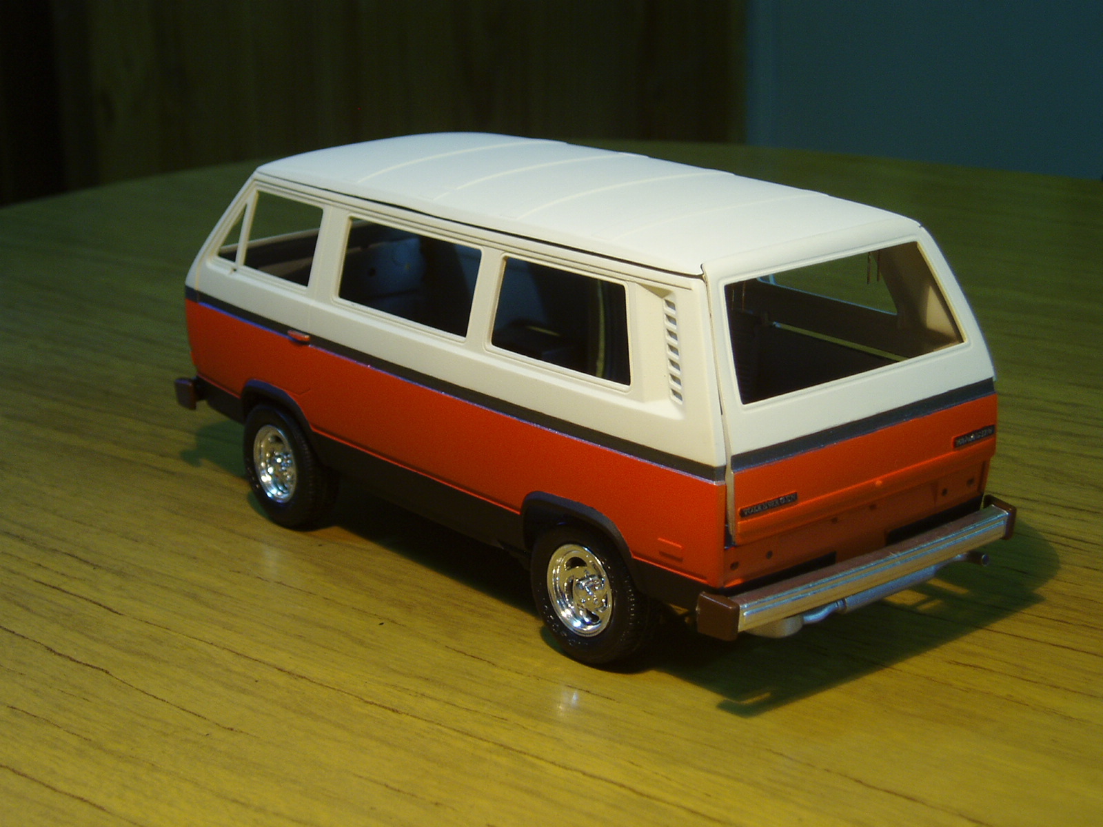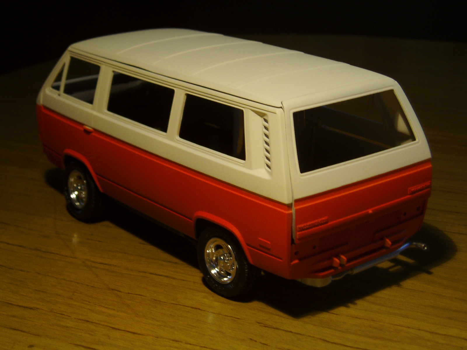 Buena pinta esa furgo, muy bien pintada, lo que no me convence mucho es el color de las llantas, ese cromado de los kits, los hace muy de juguete.