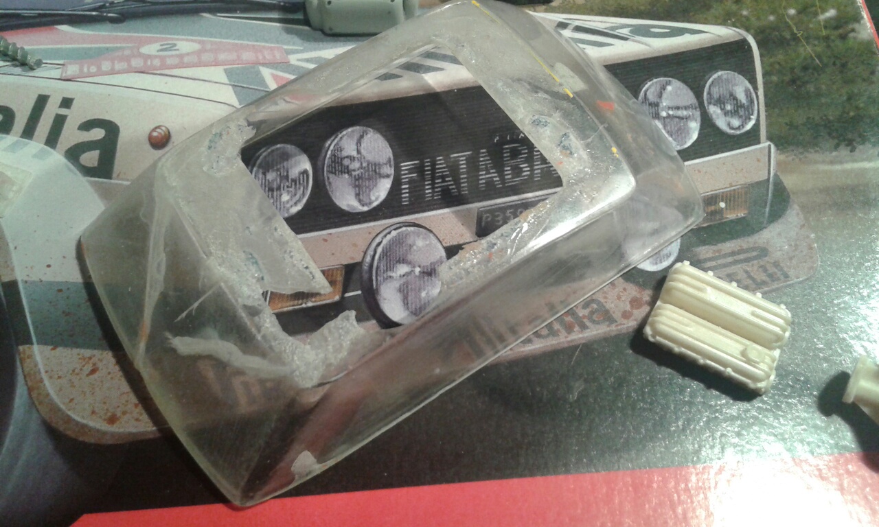 En este caso son dos 131 abarth, uno de italeri lo compre empezado e incompleto y el otro de esci montado hace siglos por alguien que sentia pasion por el pegamento, al final clonando piezas de uno para otro inventando bastante, mucho injerto de plasticard varilla de laton y mucha masilla partiendo de estos mimbres