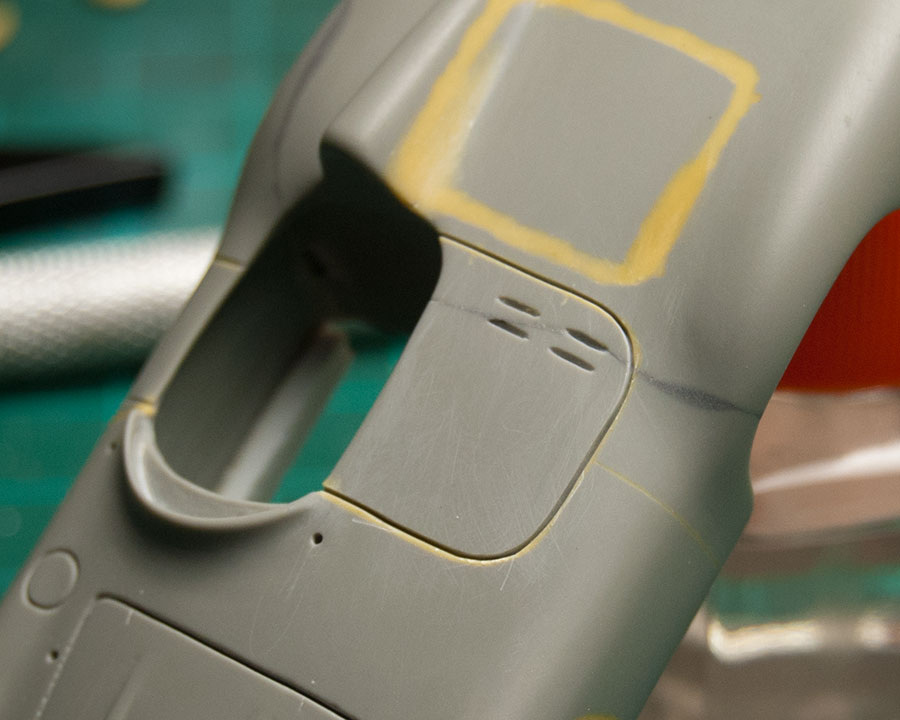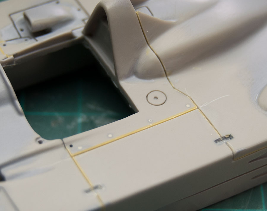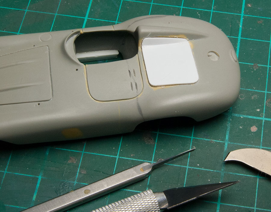 Tampoco tiene misterio: se rellenan las líneas de los paneles con masilla epoxi, y se vuelve a hacer el panel, en mi caso con la ayuda de plantillas, aunque hay por ahí quien lo hace a mano alzada... El epoxi al gusto, que cada uno tenemos preferencia por una marca u otra por sus dureza y forma de trabajarla. Y la plantilla, para líneas sencillas, las de plástico autoadhesivo como estas, son específicas para ese trabajo y son fantásticas. La que pongo en la foto la compré en Robotines hace un par de años: