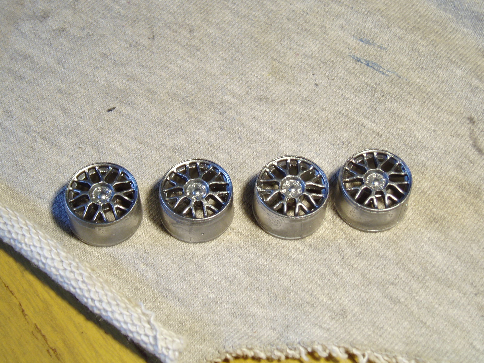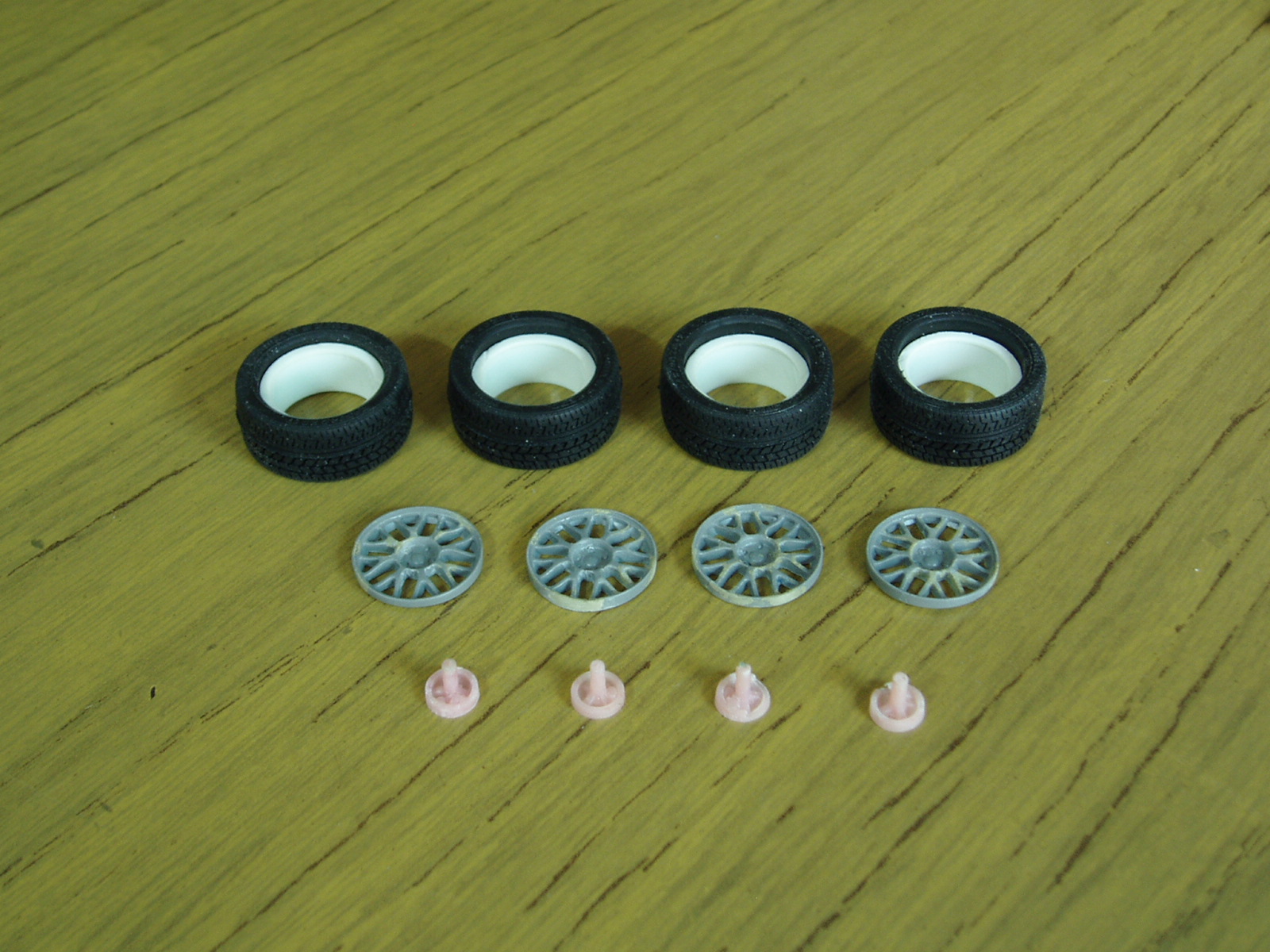 y me decante por copiar las llantas, para lo que utilice siliconas de media y baja viscosidad de odontologia, Poxipol para reproducir la parte visible (grises), acrilico dental para el eje de sujecion (rosas) y los aros de otro juego de llantas para terminar, conjuntamente con los neumaticos de ese kit.
