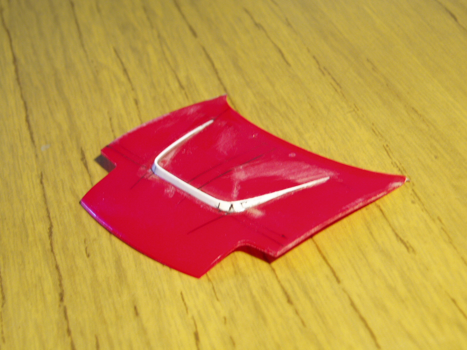Con lamina de 0.5mm de espesor hago el perfil de la toma sobre el capot, presento con pinzas para sujetar y pegar con tolueno. Una vez seco procedo a lijar y masillar, agregando una lamina de 1mm de espesor para el nervio central. Pronto mas avances.