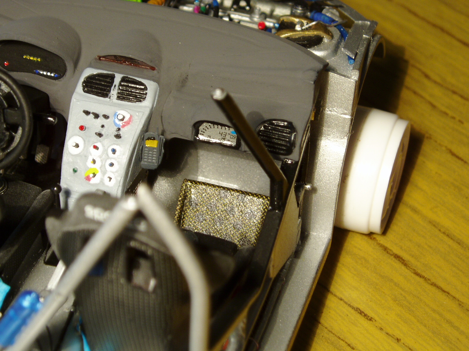 Al freno de mano le agregue los latiguillos que salen de el A la palanca de cambios la cambie por el fotograbado que me alcanzo Manafrank Los arneses del auxilio los hice con hio de cobre estañado y laton de cobre, las cintas son papel de 75gr/m2 pintados con fibron celeste Para los cinturones de seguridad use el mismo papel entintado con fibron pero con hebillas de Crazy Models. Tras pegar el salpicadero me di cuenta que me falto la centralita Magnetti Marelli a los pies del copiloto, asi que ahora veremos si la hacemos y la podemos ubicar en su sitio. Pronto mas avances.