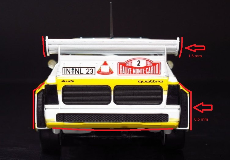 Bueno, intentaré resumir lo hecho, el problema es que las fotos que tenía del proceso estaban en el móvil que falleció hace un tiempo, grrr. Lo que hice fue: bajar la carrocería 1.5 mm, anchar y subir el borde de los aletines, cerrar un poco la parte trasera del paso de rueda delantero, reducir el avance del faldón delantero, engordar un pelín el comienzo de los aletines delanteros junto con los bordes de la parrilla donde están los faros, alargar hacia los lados 1.5 mm el alerón posterior y hacer llantas y aireadores. La decoración todo es pintura excepto los logos. Os pongo estas fotos a ver si sirven de ayuda, pues mi explicación no se si ha quedado clara :?