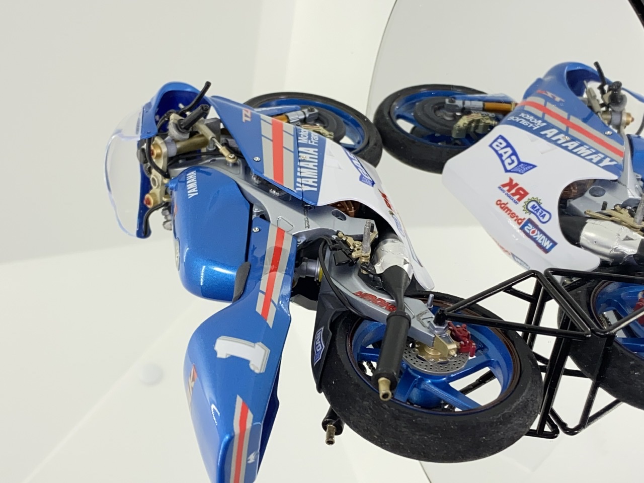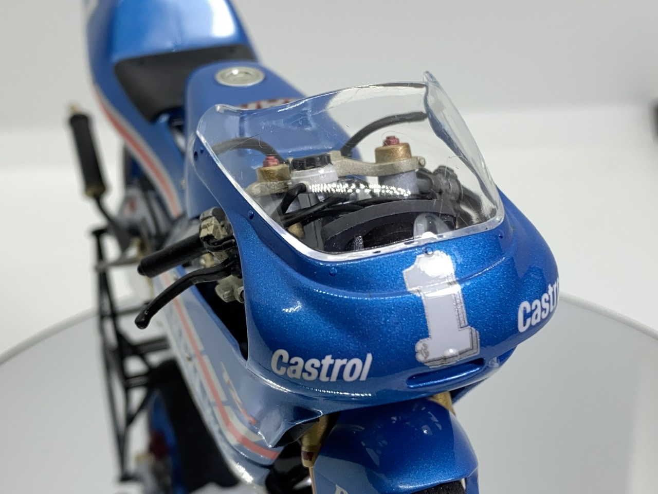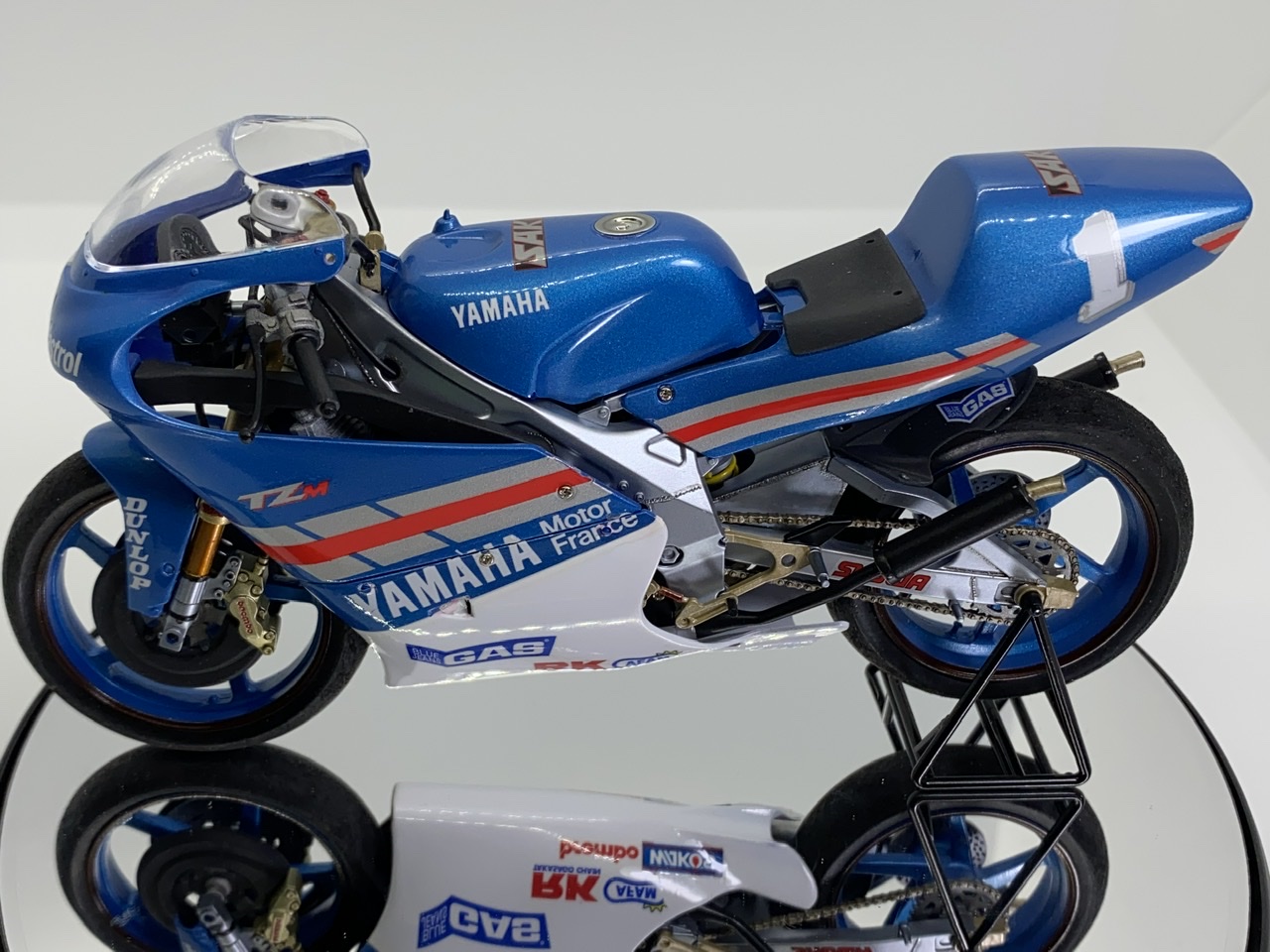 Bueno pues termina otra para la vitrina, le falta poner el cable del depósito y los tornillos de la cúpula pintarlos en plata, la he cambiado unas pegatinas pues las perdí y se iba a quedar un poco sosa, he puesto las calcas de una NSR500 REPSOL DE CRIVILLE a mi me gusta como ha quedado, espero que os guste.