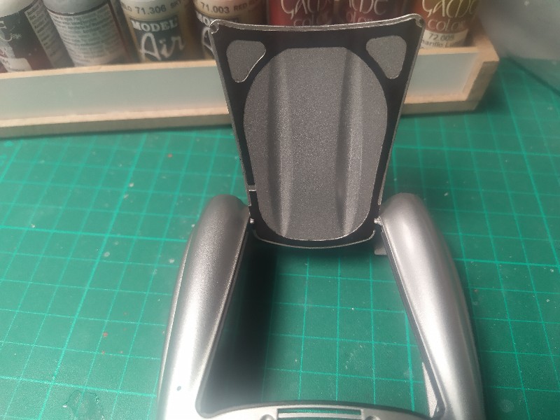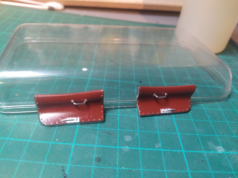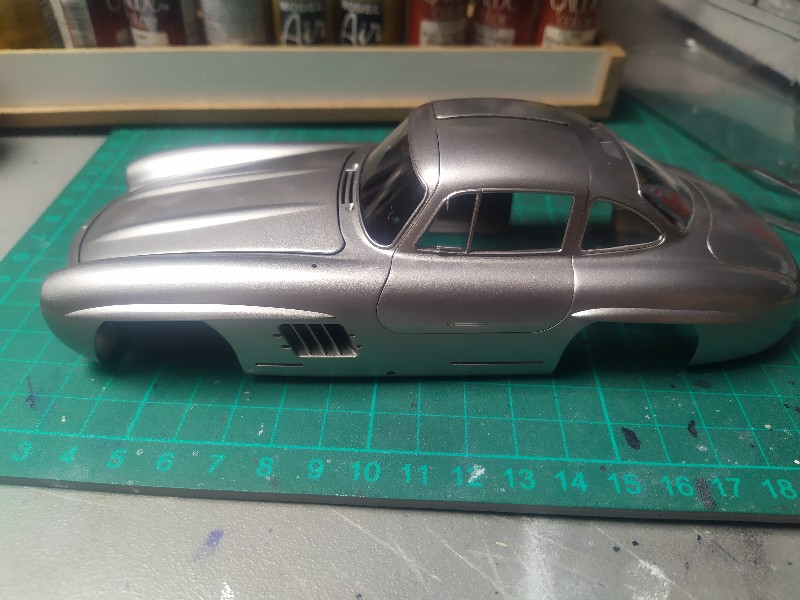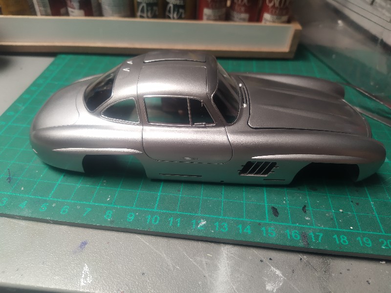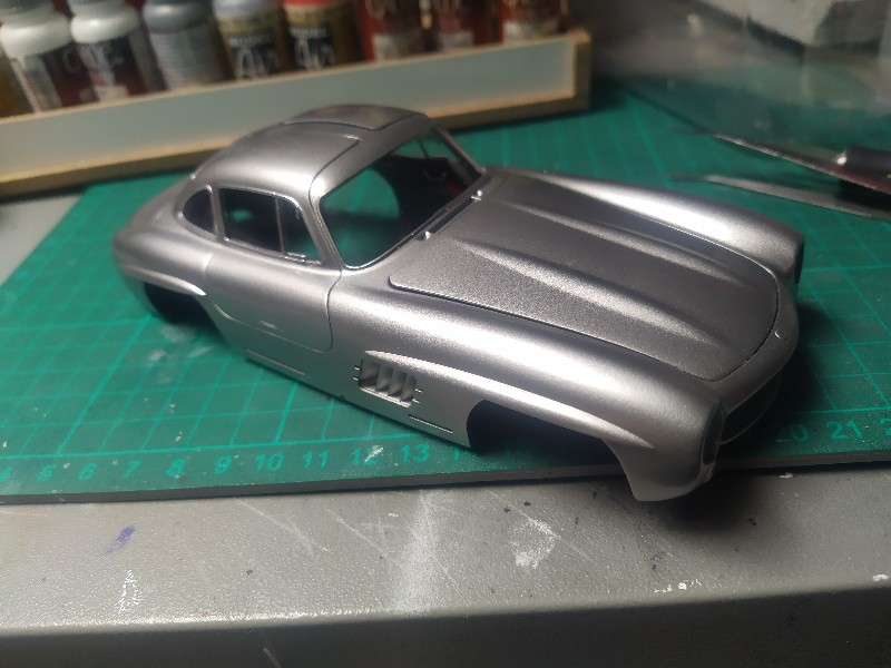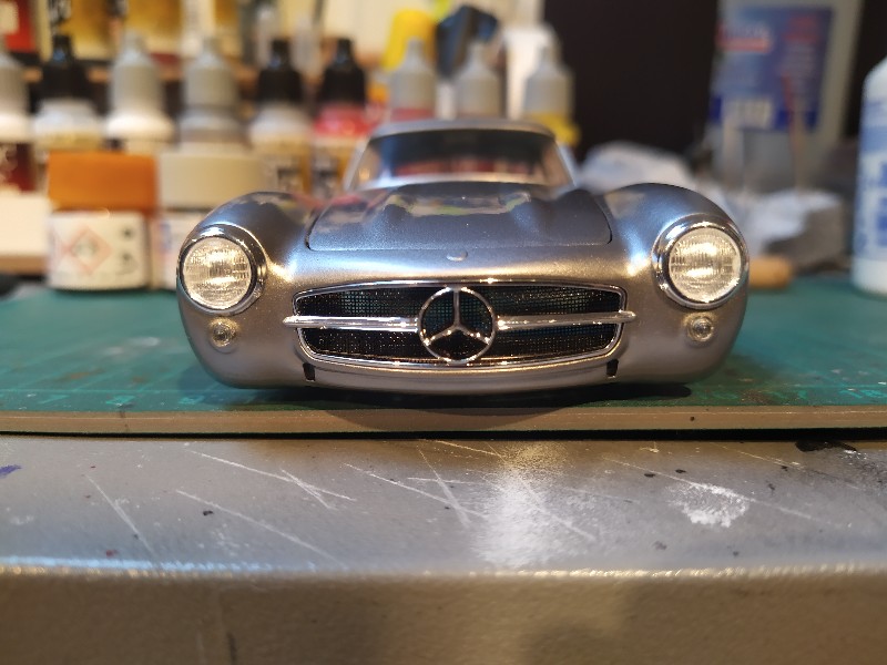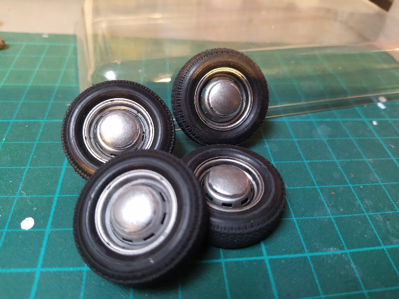 Debido a uno que fastidie con su calca correspondiente he tenido que lijar la estrella de Mercedes y dejarlos con un toque viejuno que no me disgusta del todo. El borde cromado lo hice con bare metal foil. Las calcas las pondré cuando las compre en el siguiente pedido.