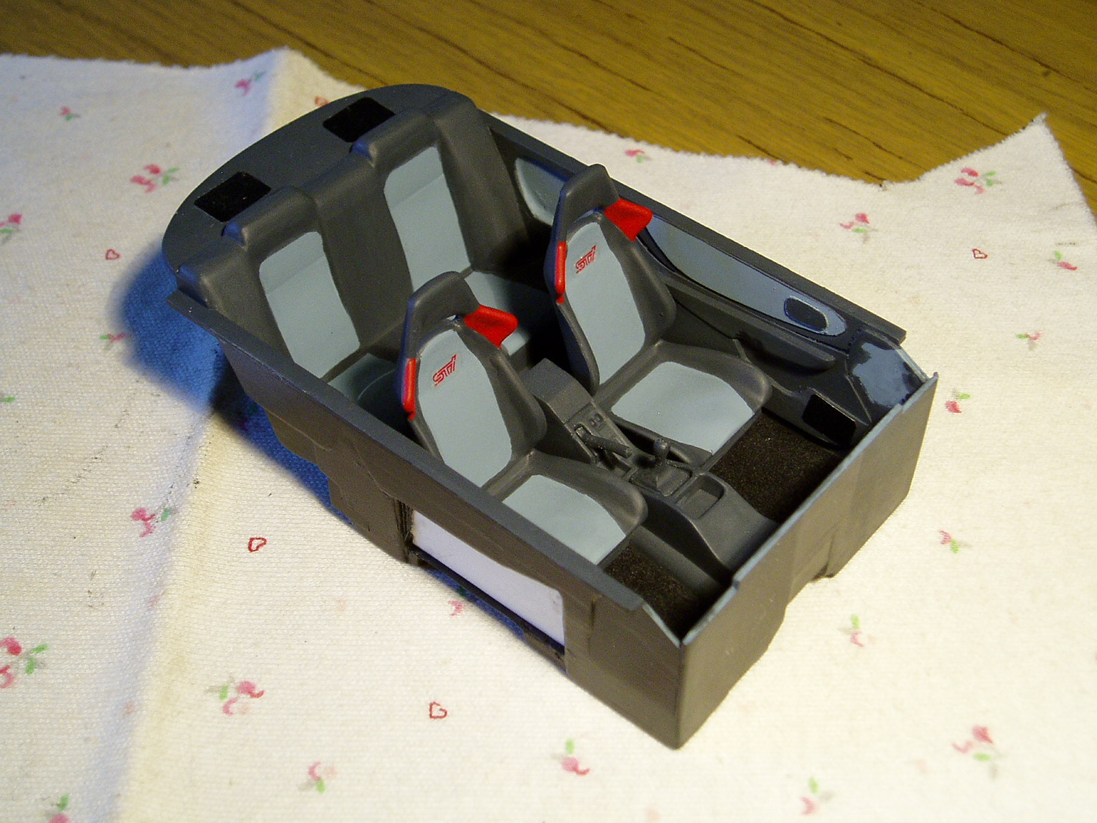 estuve con el interior dando pintura, un gris azulado de base y luego un gris oscuro; puse felpina negra como alfombras y papel de cigarrillos negro para los parlantes Lo mismo para las butacas agregando segun referencia las zonas rojas que pinte con bermellon y las calcas e instale el freno de mano y la palanca de cambios Para el salpicadero use gris oscuro y detalles en negro, aplicando la calca correspondiente Terminado el interior se pego al chasis. Pronto mas avances de este Impreza.