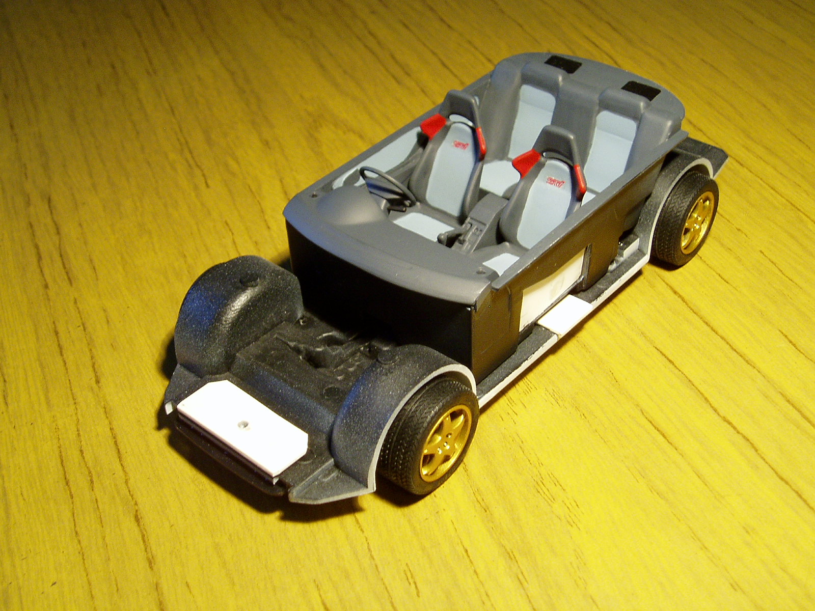 estos dias estuve pintando la carroceria, pintando con gris de fondo y blanco encima, para terminar dando barniz sobre las calcas. Ahora toca seguir con el interior, para cuando seque completamente el barniz pulir la pintura.