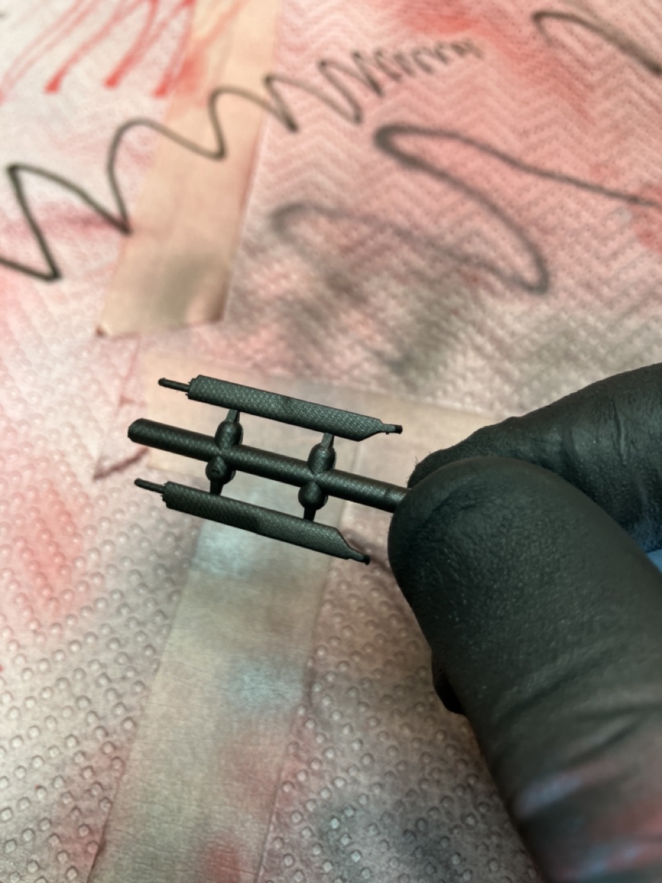 Ya tenía todas las piezas pintadas con negro semi-mate y utilicé una media poco tupida para envolverlas y aerografié gun metal (tamiya LP-19) por encima.