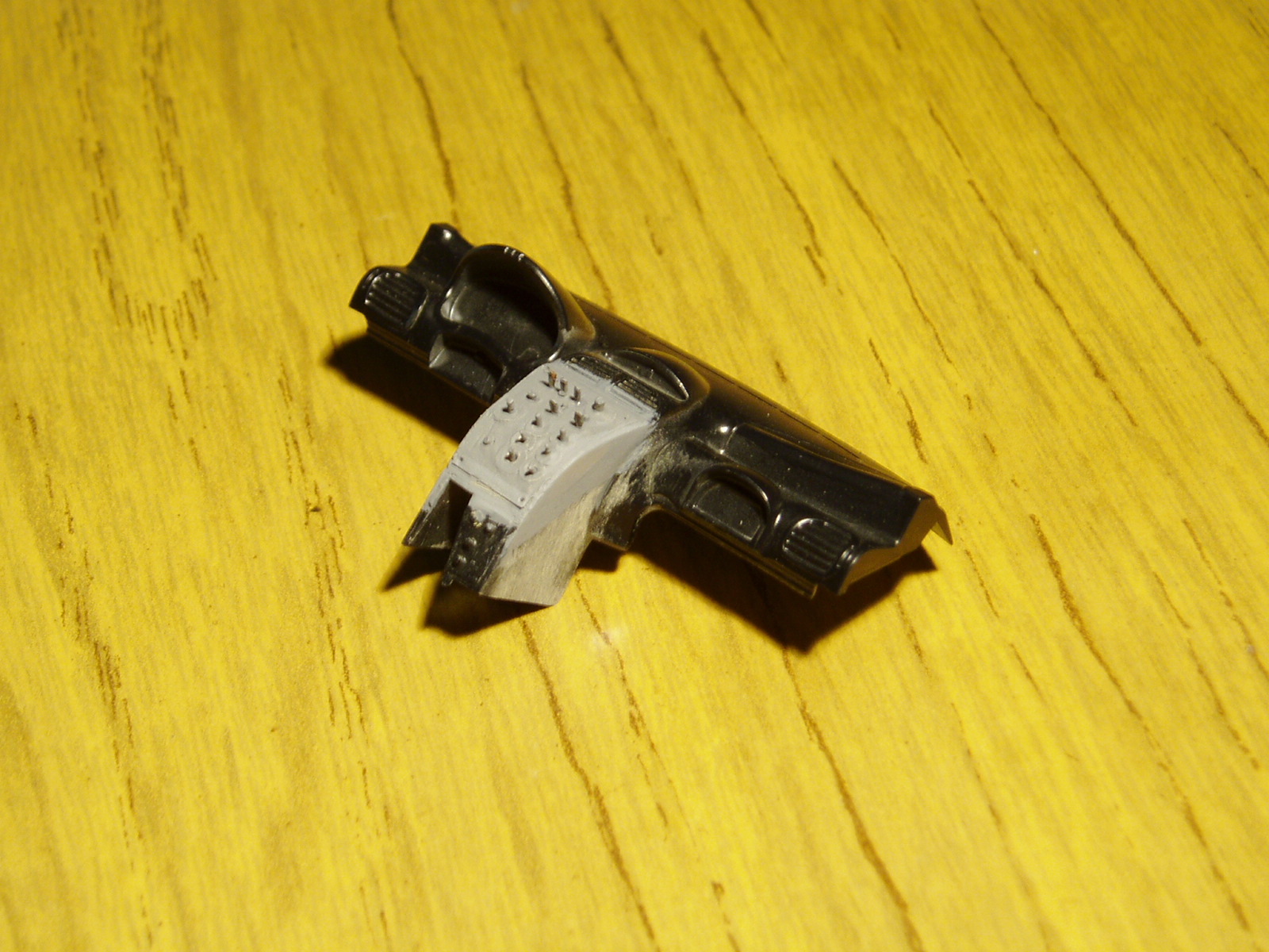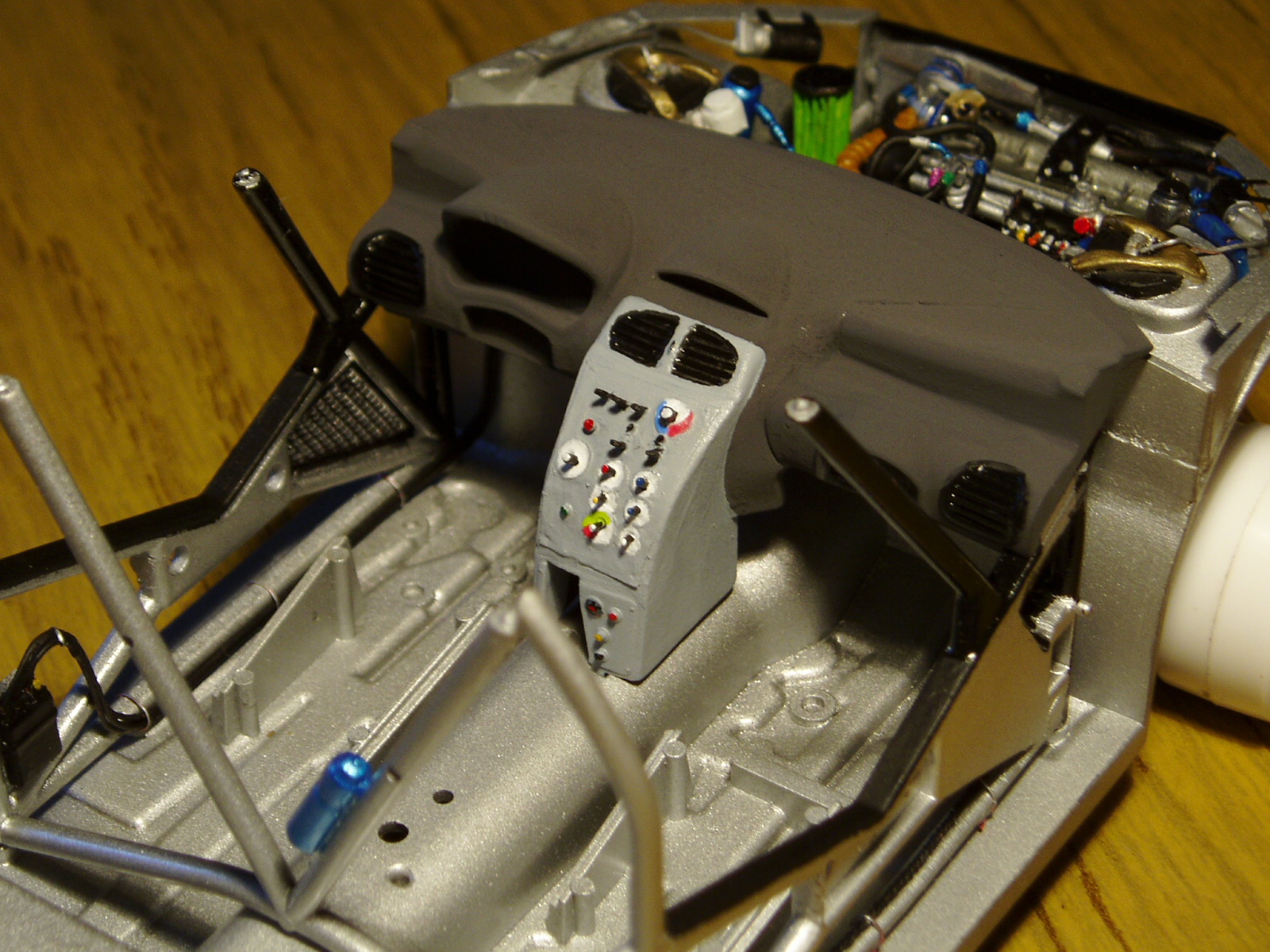 estuve trabajando con el interior precisamente con el salpicadero el cual Tamiya no modifico al ir lanzando nuevas versiones y todas tienen el salpicadero de 1999, en mi caso tendria que ser 2002, asi que toco modificar ligeramente, convirtiendo lo que era concavo en convexo y realizando todos los controles a scratch, por ser mi primer salpicadero a scratch estoy conforme. Las fotografias