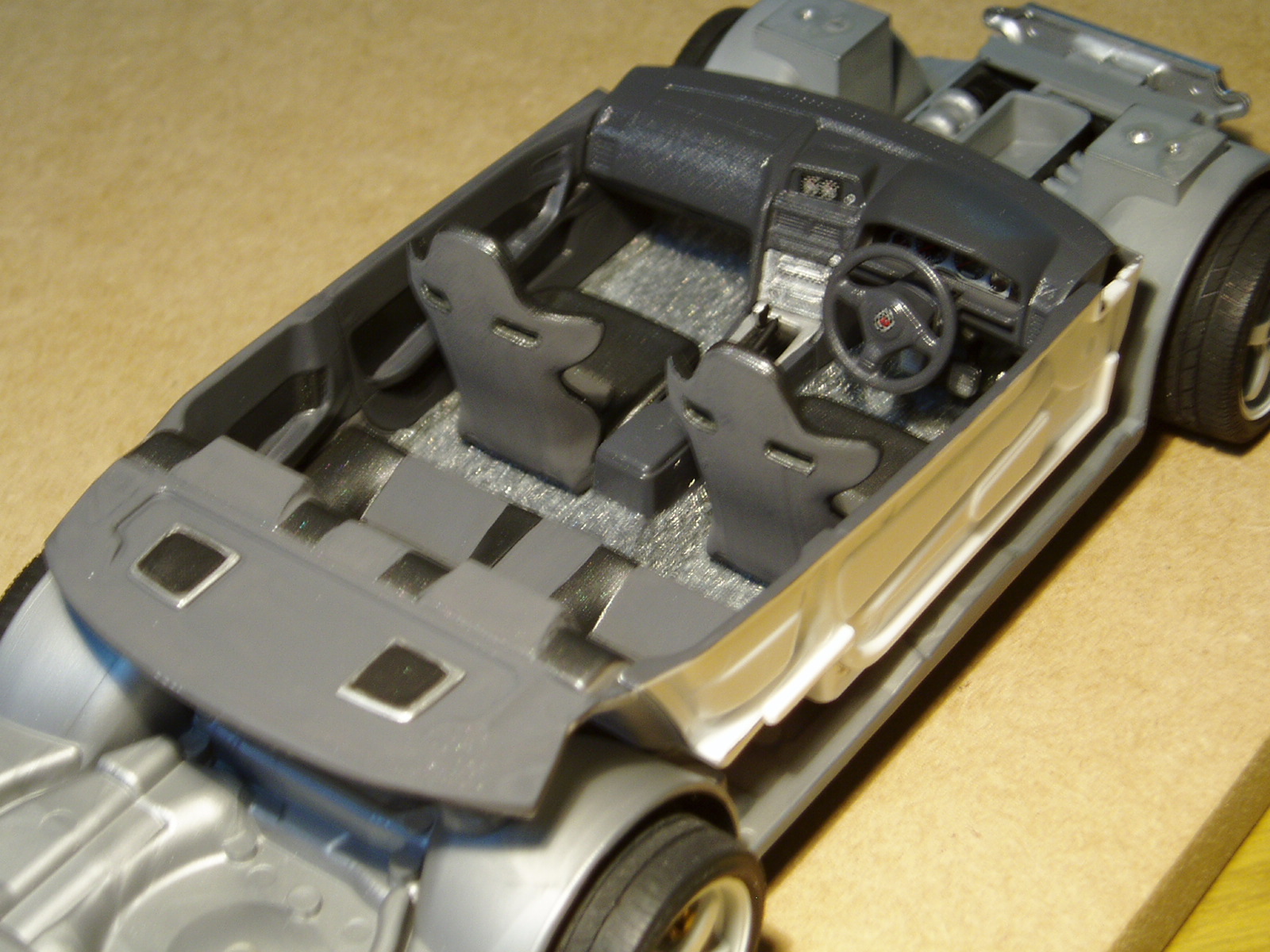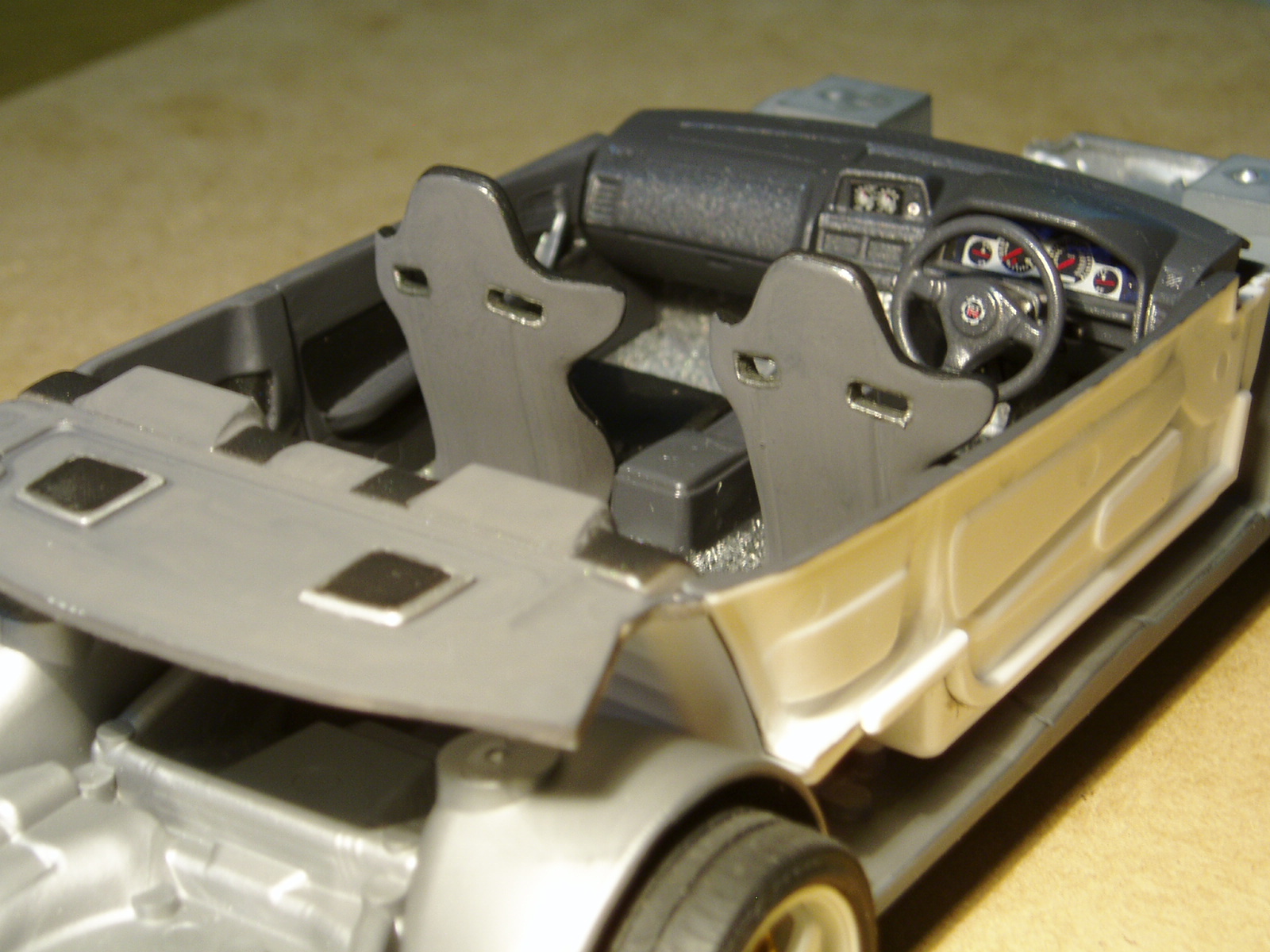 ayer estuve con la carroceria, pintando el techo interior, los intermitentes laterales y las luces delanteras y trasera, ademas de "platear" las restantes, tambien pegue las rejillas delanteras y pinte el spoiler delantero; hoy vere si hago algo de tiempo y pinto los cristales y asi tenerlo casi listo para cerrarlo. Por el momento esta asi Pronto habra mas novedades.