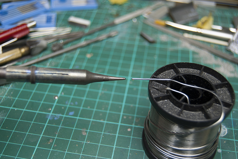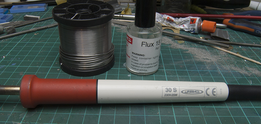 Respecto a lo que sale en este montaje, te puedo decir lo que uso y cómo lo uso, que no sé si es lo más eficaz: Soldador ordinario JBC de 25W (si el tuyo es más potente, puede dar problemas con el metal blanco). Flux normal de las tiendas de electrónica, también JCB, y un carrete de estaño-plomo-cobre que tenía en casa y que no tiene ninguna propiedad especial.