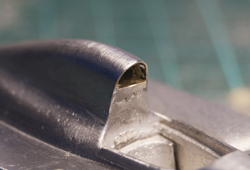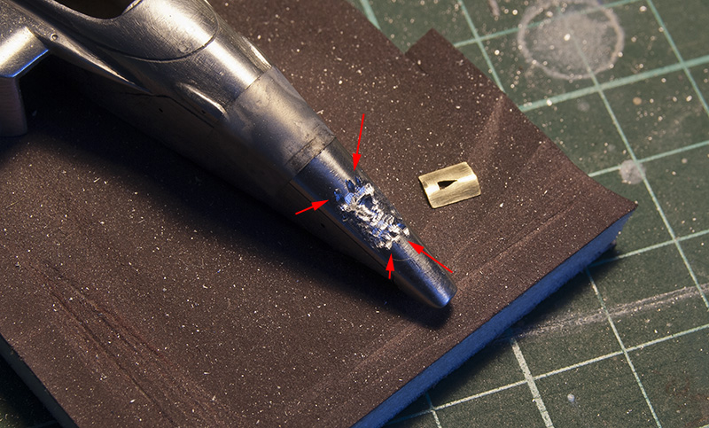 Primero, en la foto del cajeado de la toma NACA delantera se ve que el cajeado tiene unas ranuras feas alrededor: Eso es para que el estaño entre bien y se adhiera a los bordes, que si no, luego al lijar e igualar con la superficie exterior, te llevas el estaño y la pieza se va al carajo.