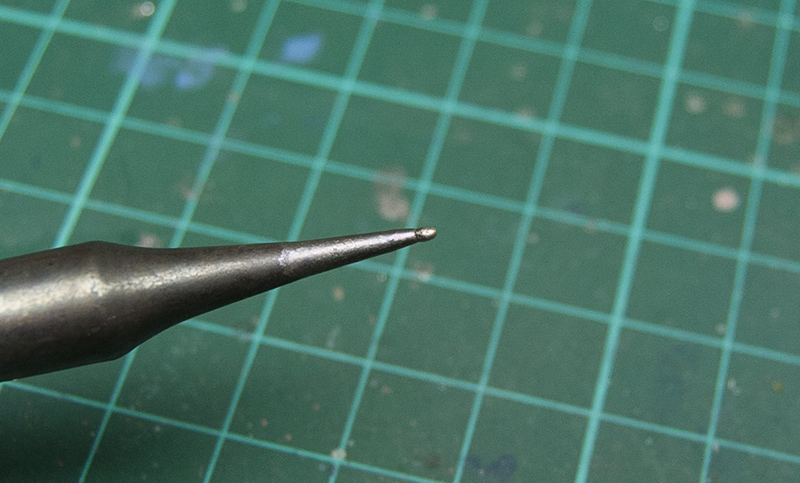 Acercas la puntica del soldador, longitudinalmente al hilo de estaño: Y retiras una pequeña gota, que puede ser más o menos hermosa, pero ya la tienes en la punta y puedes dar un toquecito rápido. Por cierto, para los que son nuevos en esto: no quedarse pensando con la punta del soldador cerca de la maqueta, lo digo por experiencia...