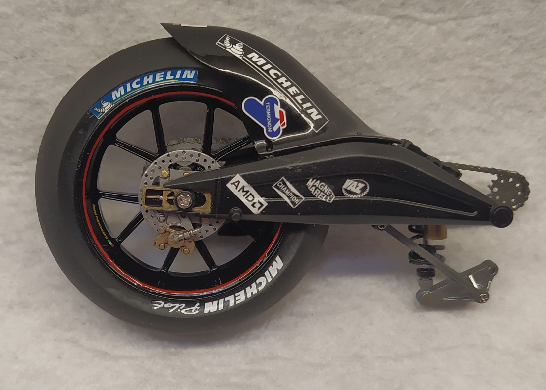 Gracias por los comentarios y me alegro de que os guste. Os dejo el basculante con la rueda trasera. No ha quedado tan limpio como me gustaría en la zona de las calcas del basculante y tendría que lijar y repintar pero me arriesgo a quedarme sin calcas así que lo dejaré como esta..
