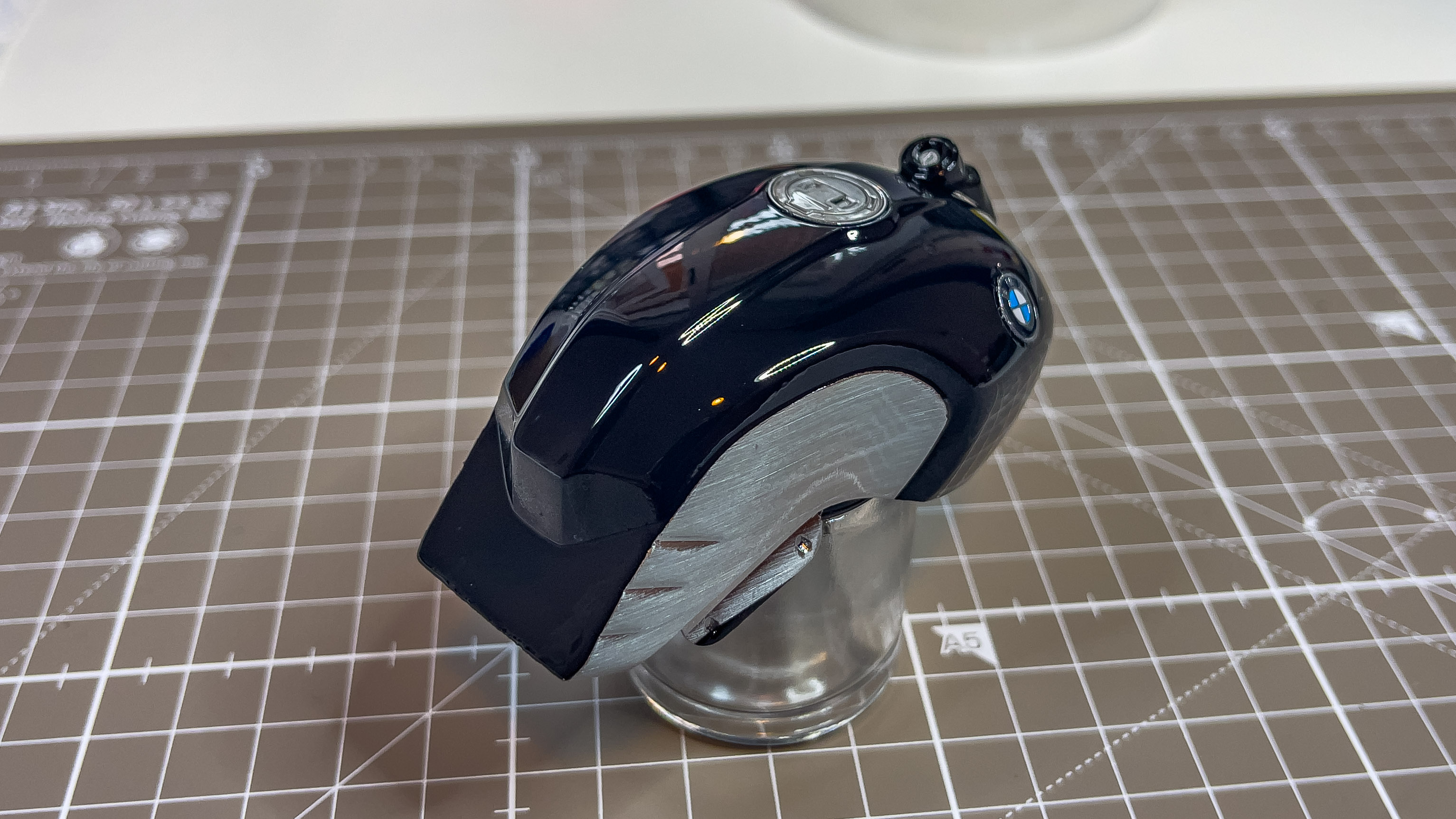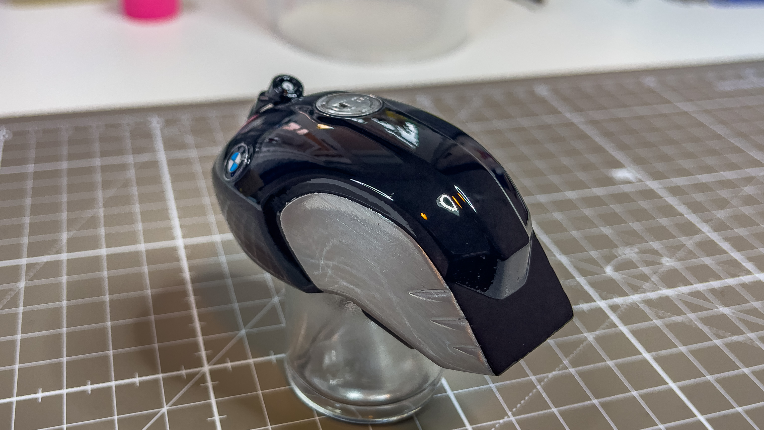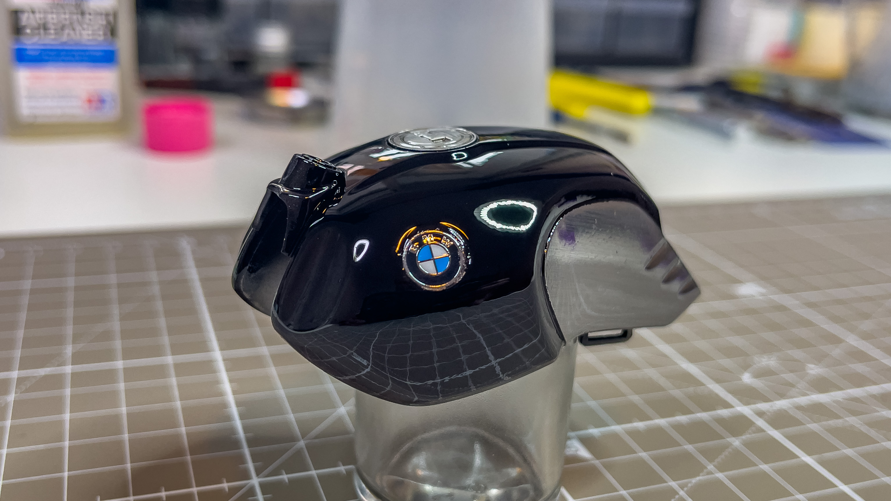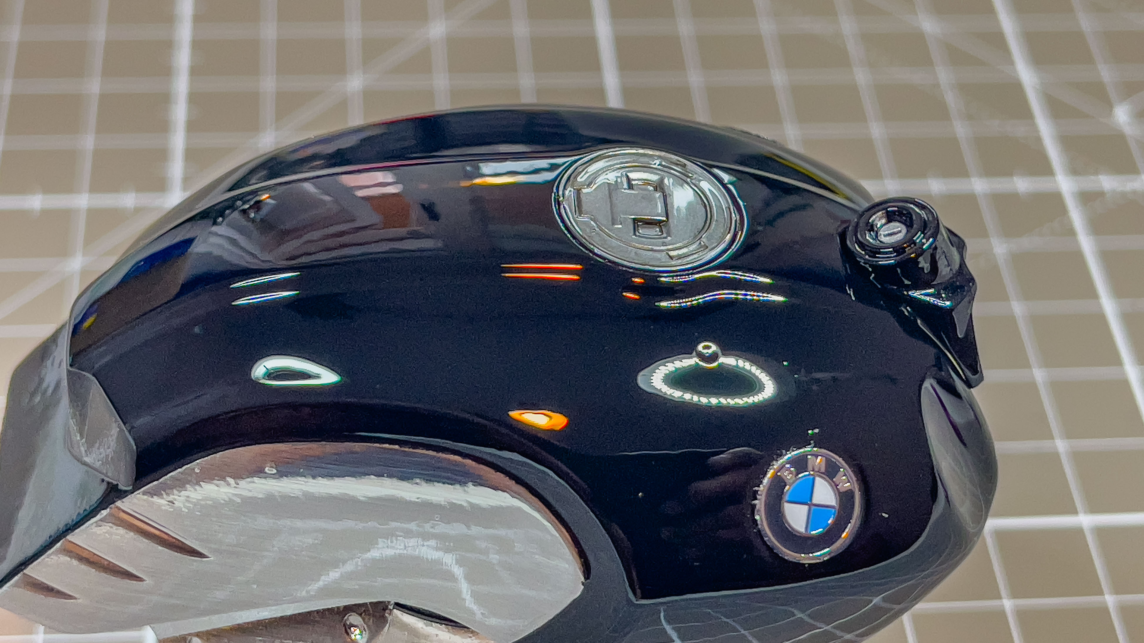 El depósito ha quedado sorprendentemente bien, le tuve que lijar una huella de mi dedo impaciente en la pintura negra con lijas hasta grano 12.000, la laca de Number5 de dos componentes lo ha cubierto y ni se nota y me siento cómodo aplicándola de una tirada. Esta mañana, al destaparlo me he encontrado como si fuese un crater en la laca que se aprecia en la última foto, no es una mota, es hacia adentro, como si tuviera un bollo el deposito. No me preocupa, apenas se nota pero me ha sorprendido.