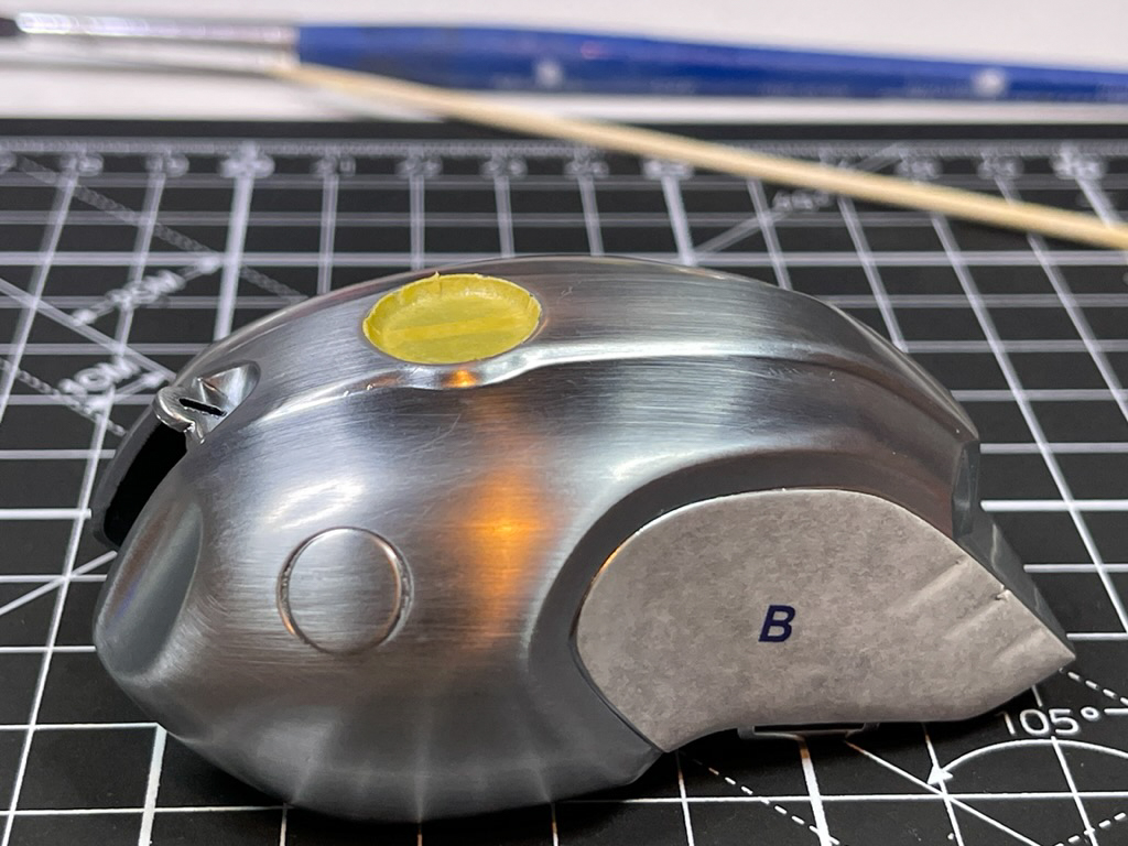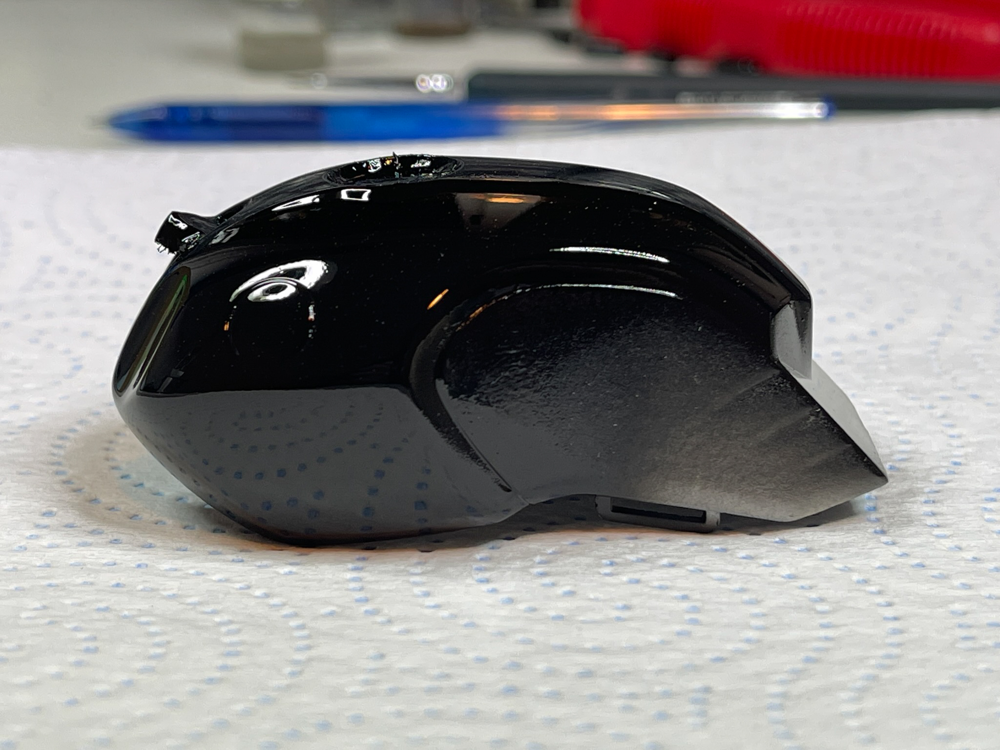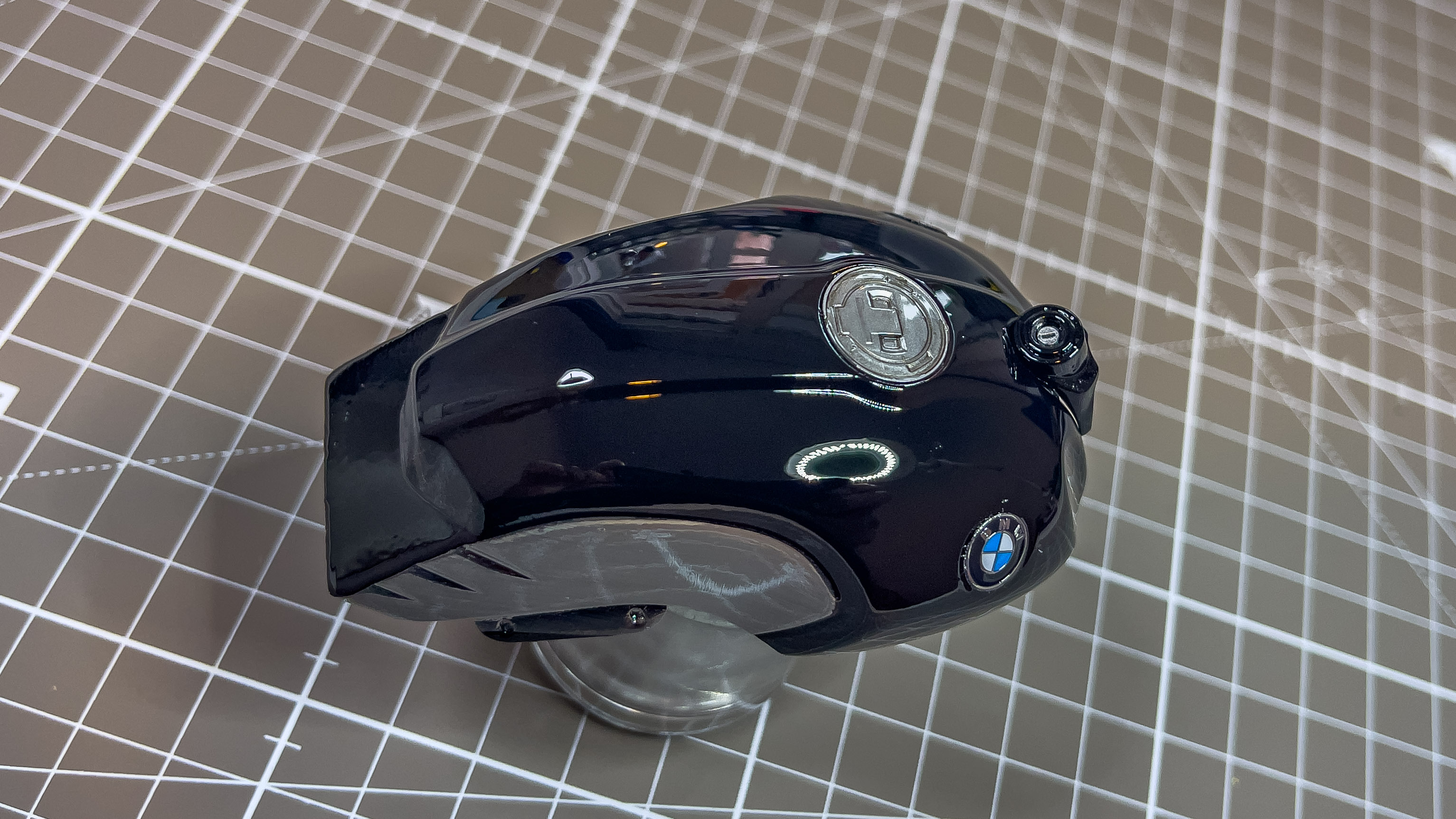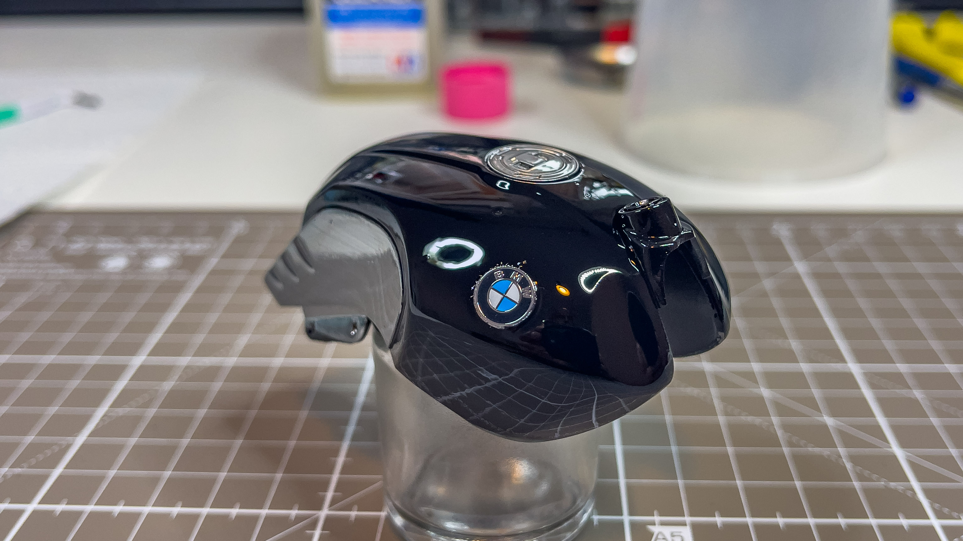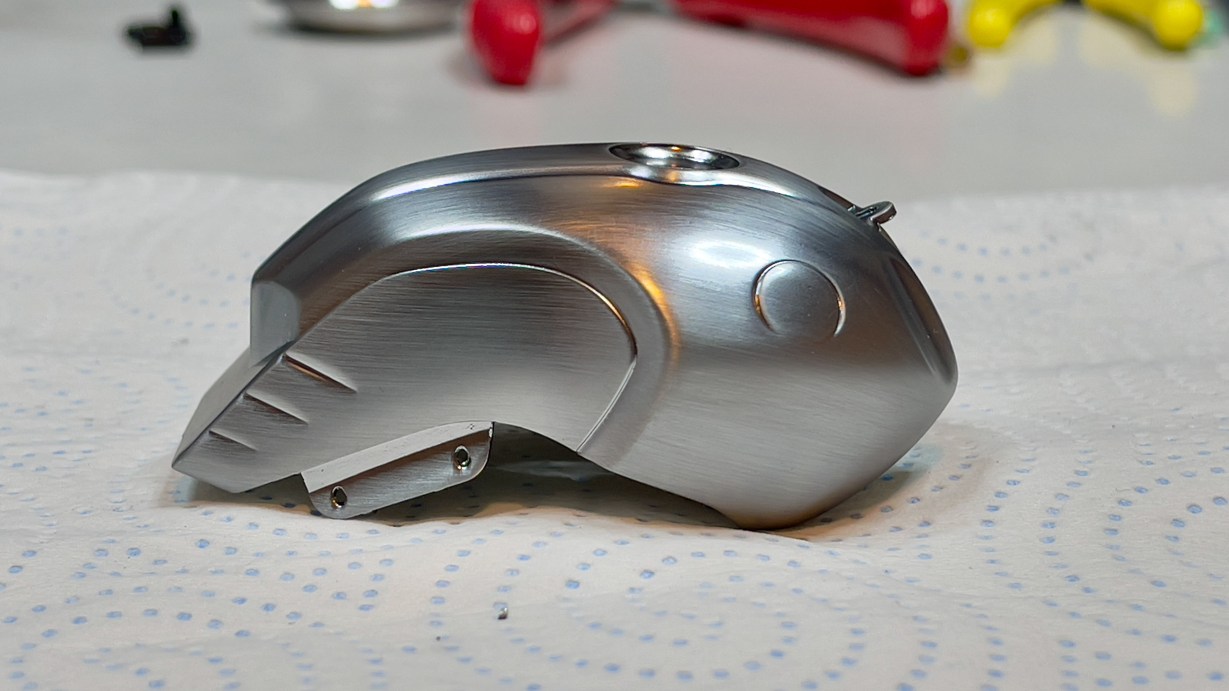 El depósito ha quedado sorprendentemente bien, le tuve que lijar una huella de mi dedo impaciente en la pintura negra con lijas hasta grano 12.000, la laca de Number5 de dos componentes lo ha cubierto y ni se nota y me siento cómodo aplicándola de una tirada. Esta mañana, al destaparlo me he encontrado como si fuese un crater en la laca que se aprecia en la última foto, no es una mota, es hacia adentro, como si tuviera un bollo el deposito. No me preocupa, apenas se nota pero me ha sorprendido.