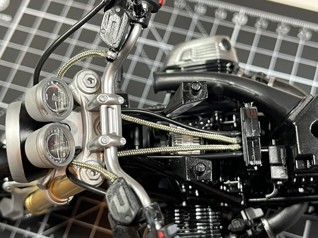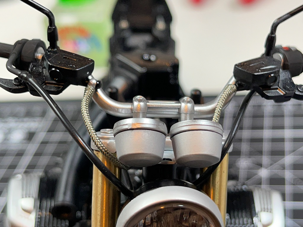 A ver si consigo ponerle algún detalle en blanco en las piñas del manillar para imitar las señales de los botones, pero ya pintar cada uno me costó un pulso del que carezco!!!