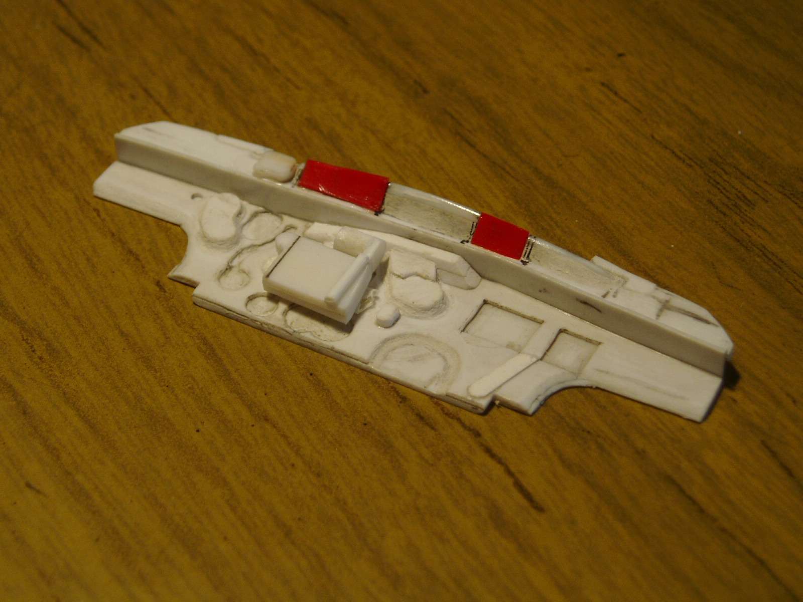 Con plancha de 1mm de espesor realice dos rectangulos que van a dar la altura de la moldura del pasaruedas delantero (pegando longitudinalmente la pieza del lado de abajo) con lamina de 1 mm dibujo la pieza del frente que sostiene el radiador, corto y lijo y la pego a las piezas anteriores y asi queda todo pegado y masillado (menos el radiador que esta presentado) Por ahora es todo.