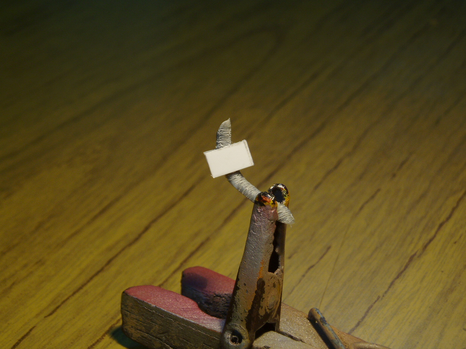 con parte del arbol y soldador de electronica hago la manguera dando forma con calor y lija; la textura la hago haciendo rayas con el cutter. La caja es de lamina de 0.5mm de 8x5x4mm perforando frente y dorso para pasar la manguera.