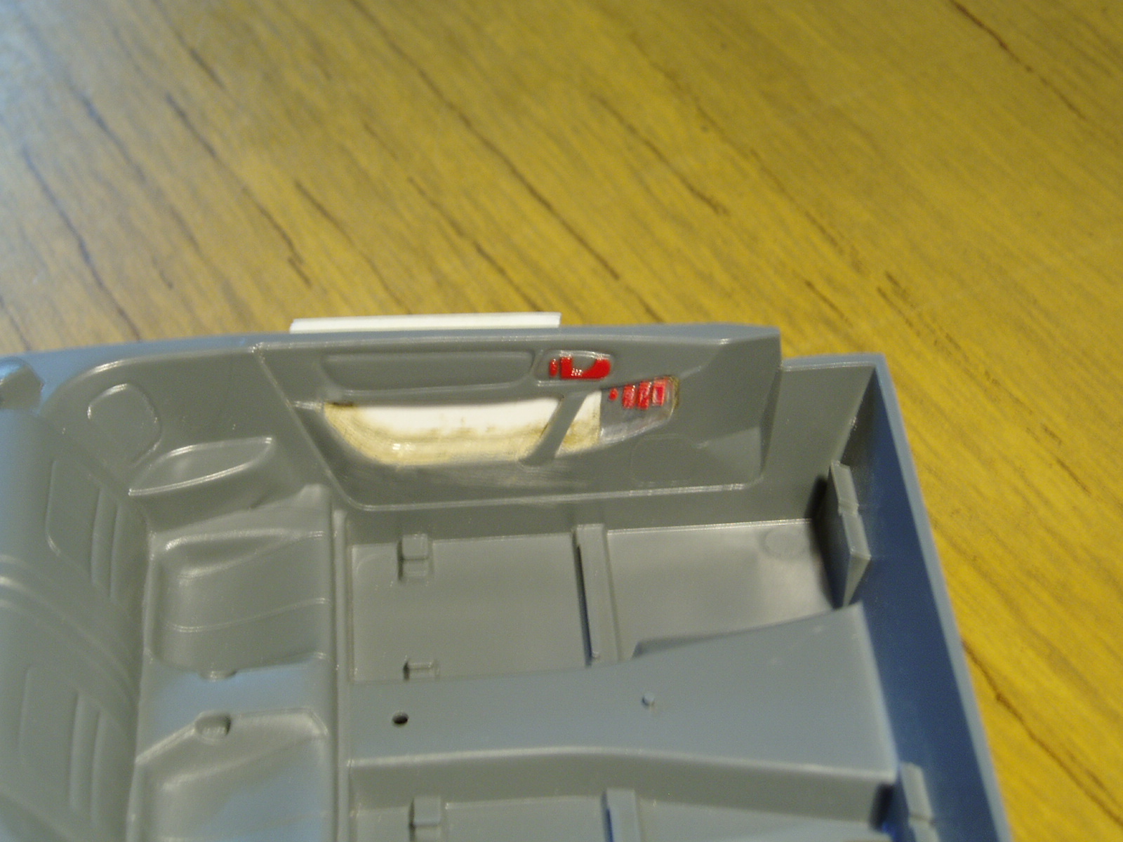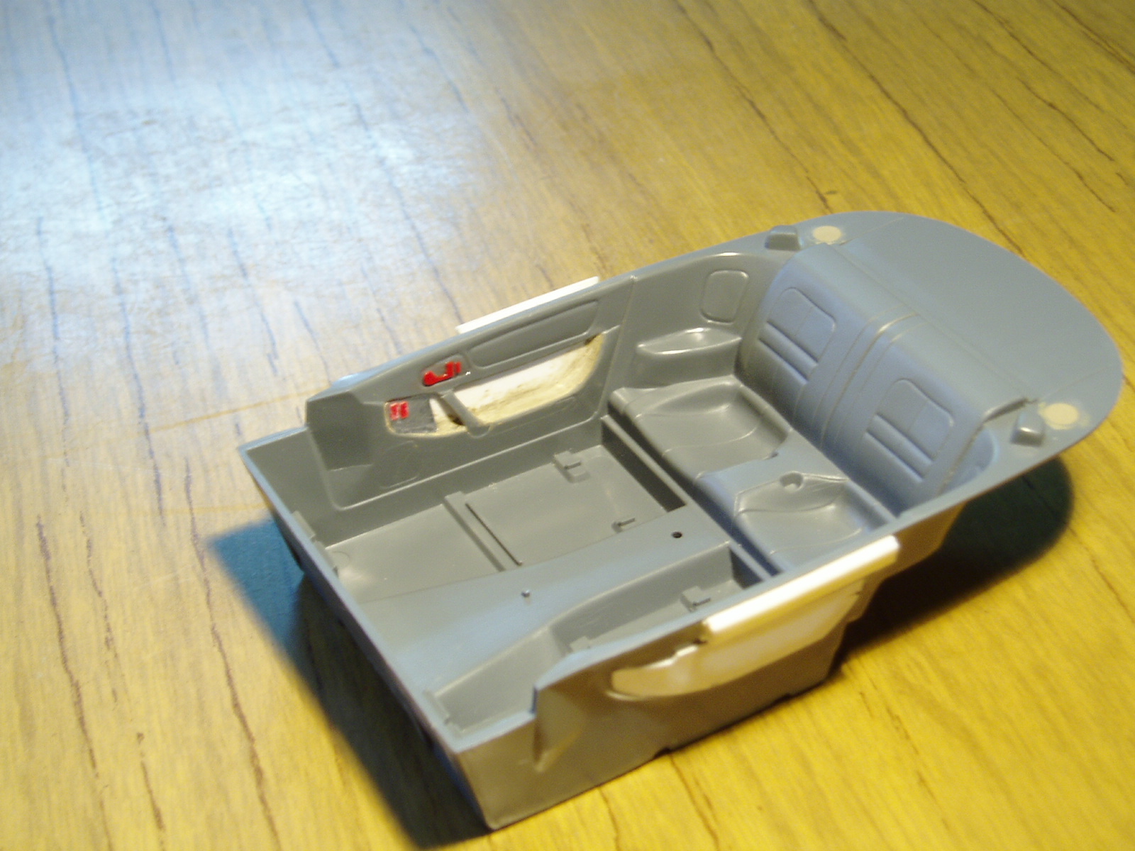 y empezamos con el interior mientras sigue secando la carroceria. Para empezar rellenamos los respaldares de las butacas delanteras que vienen huecos, tambien algunas marcas de molde y recortamos los paneles de puertas para darles algo mas de profundidad. Seguiremos informando.