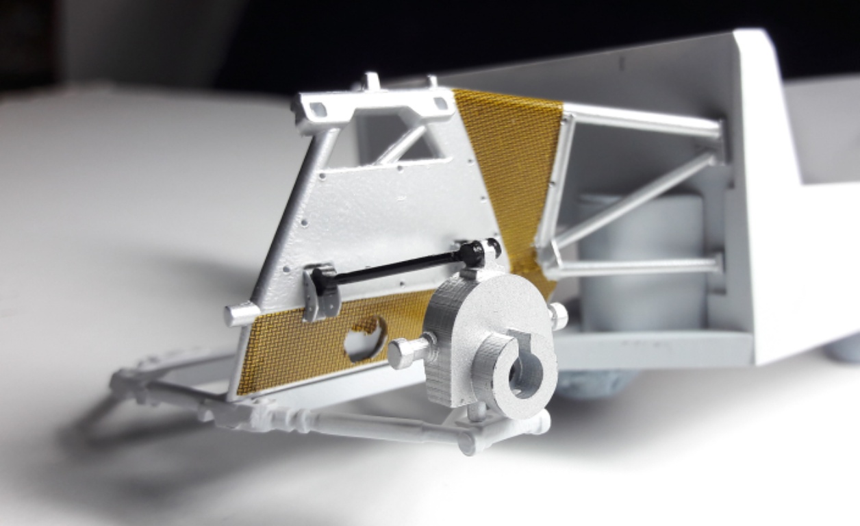 Más piezas modificadas: esta pieza sujeta la estructura del motor con el cortafuegos trasero. Le he colocado unas pletinas de metal y tuercas, todo imprimado con Gravity y pintado con aluminio Metal de Zero: