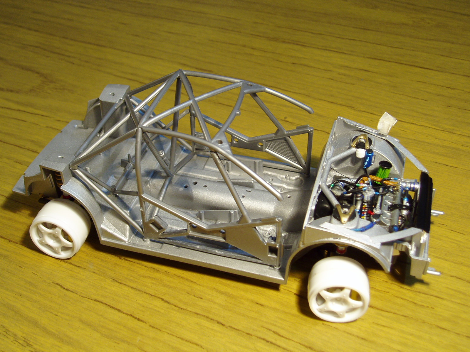 aqui estamos con la jaula a la cual le pegue solo los laterales (no al chasis) y trabaje un poco para que se parezca a la real las llantas son un regalo de Manafrank que estan alli para que no este tocando el chasis contra el suelo. El tren trasero esta aun sin pegar.