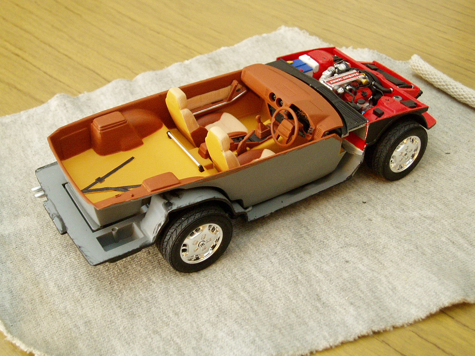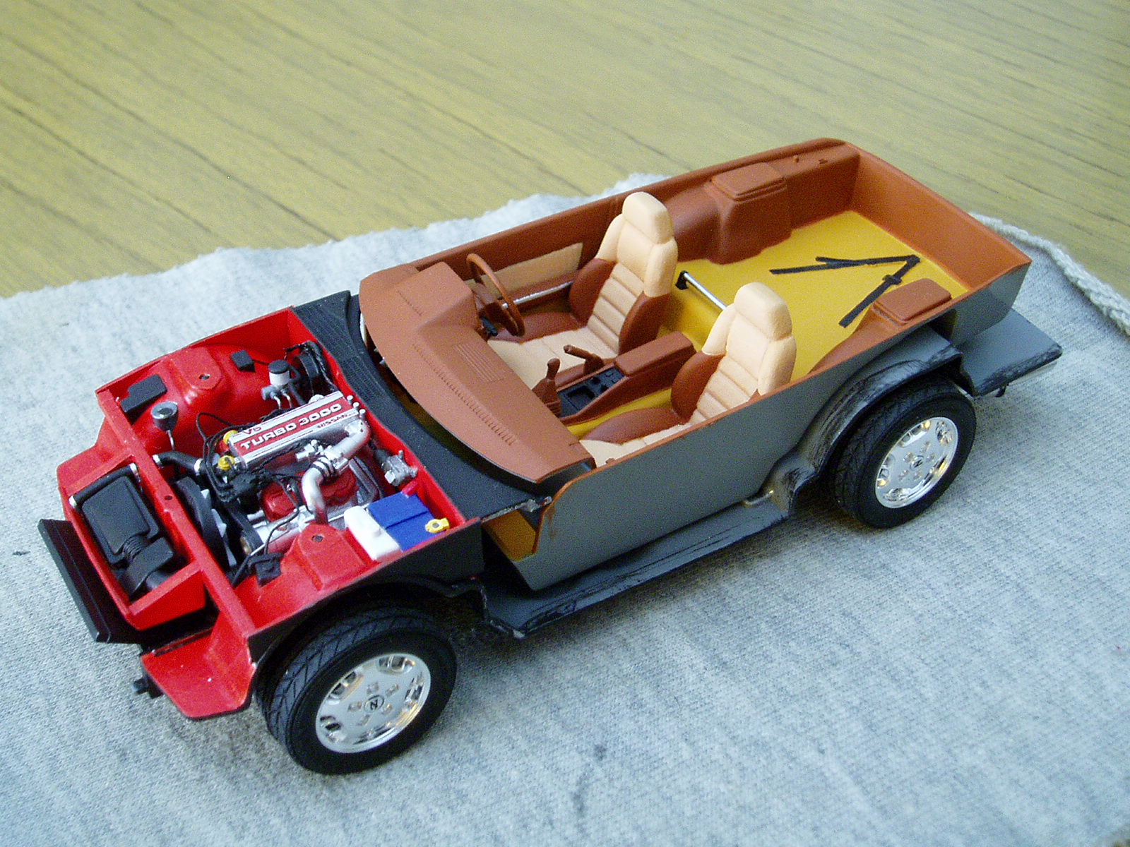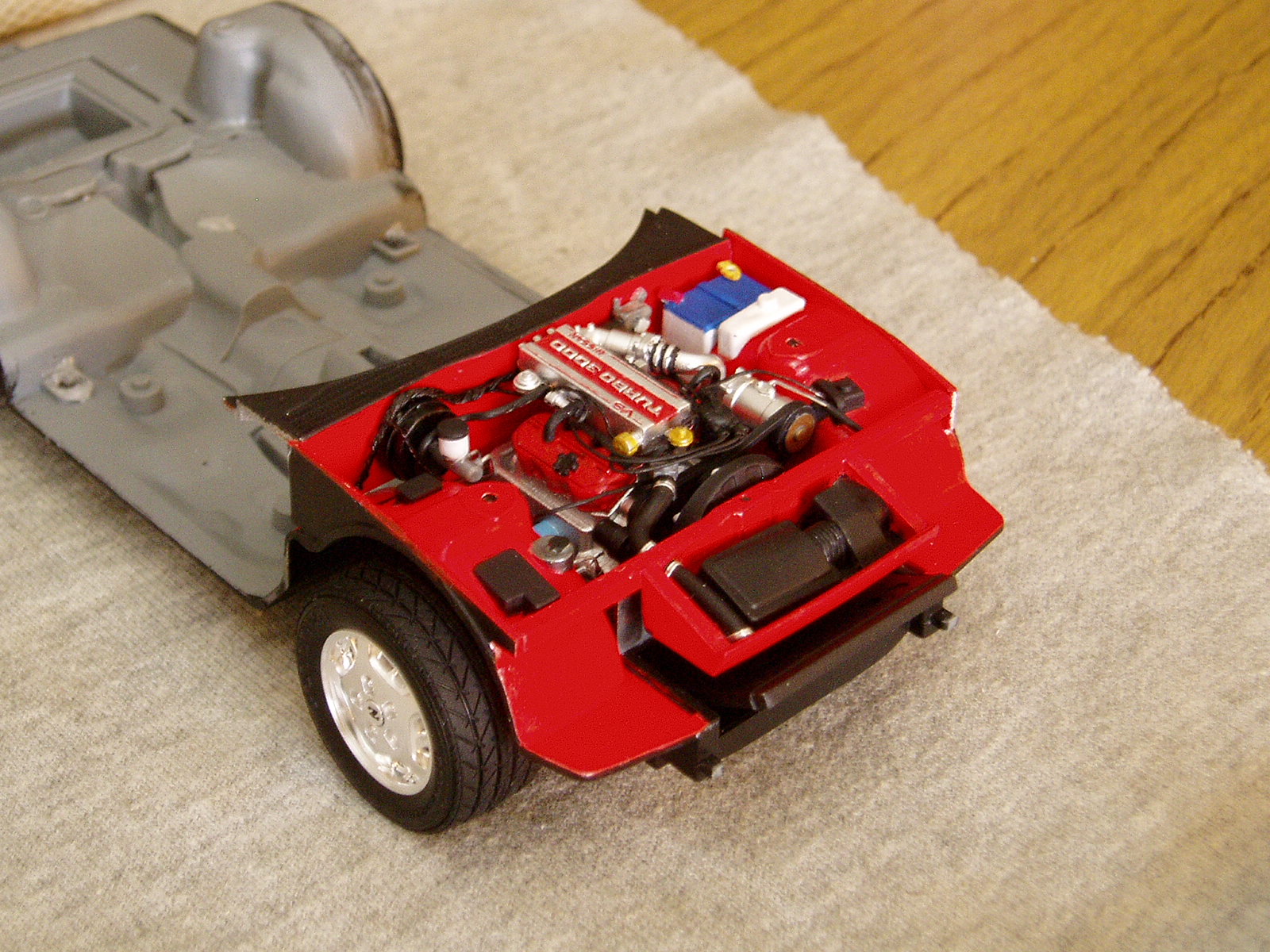 consegui esta maqueta de casualidad y empece con ella hace unos dias, ya tengo el chasis listo chasis Decidi despues de buscar unas cuantas fotografias en internet del mismo, pintarlo de color rojo (Bermellon para ser mas exactos) pero para ello falta bastante aun, hoy si puedo empiezo con el interior el cual sera de color beige. Creo que quedara bien la combinacion.