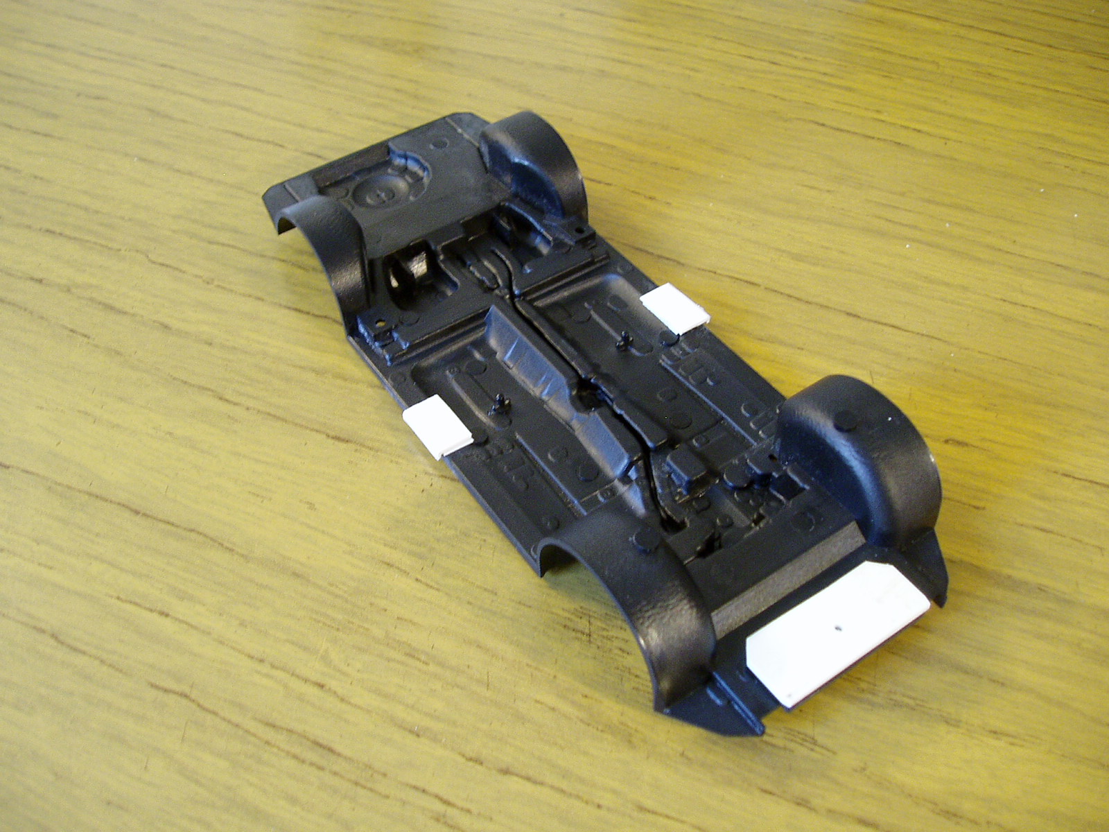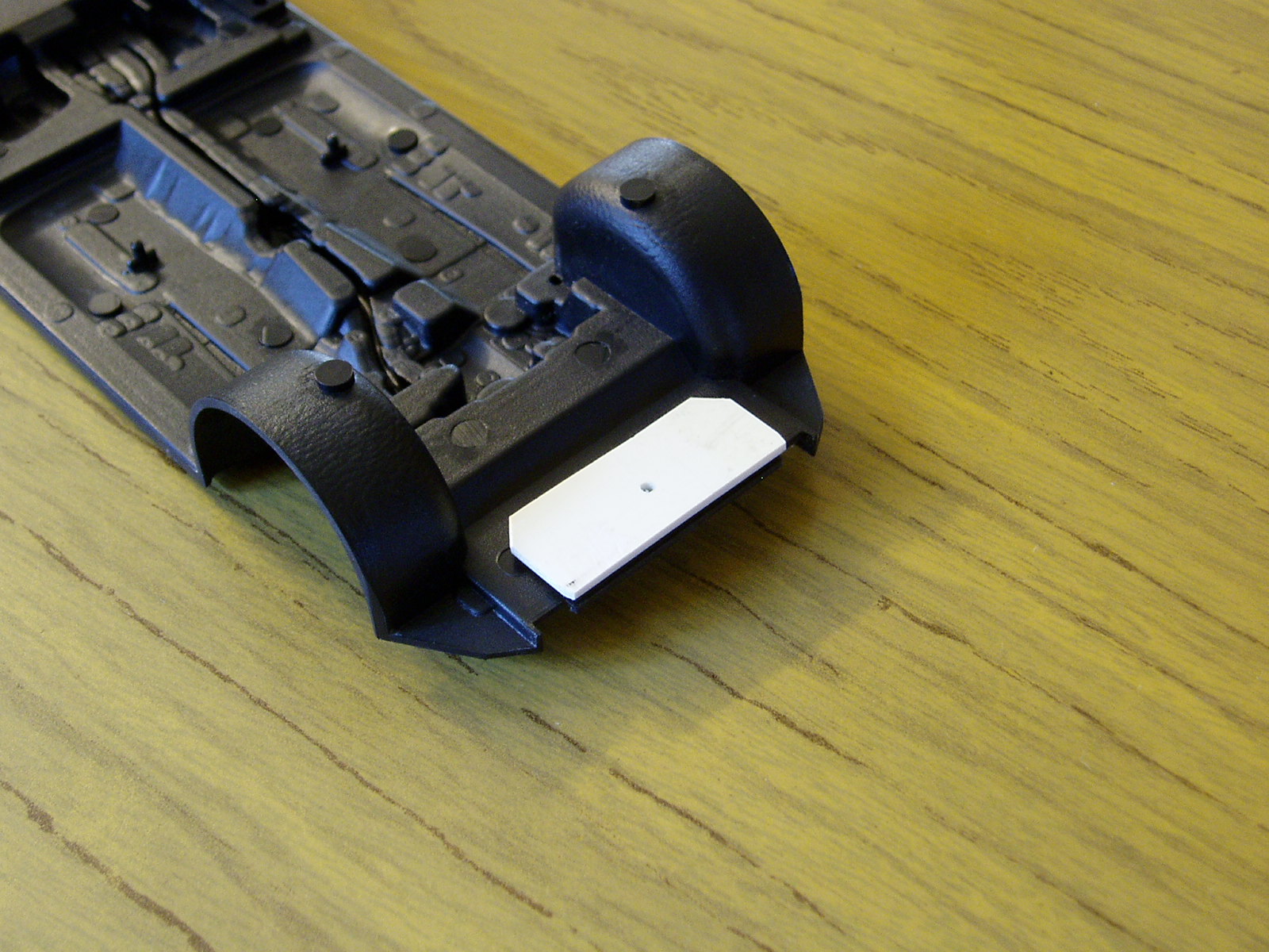 empezamos con el kit; encontre holguras entre carroceria y parachoques delantero, asi que toco rellenar con lamina de plastico como la altura del tren delantero era baja, modifique el anclaje entre la carroceria y el chasis, replicando el anclaje original en la parte delantera con lamina de plastico de 1mm como quedaba luz entre carroceria y chasis lateralmente, decidi hacer unos enganches laterales para solucionar este problema, si falla el anclaje esta la opcion de pegarlo y por ultimo el chasis ya con su pintura base Pronto mas novedades.