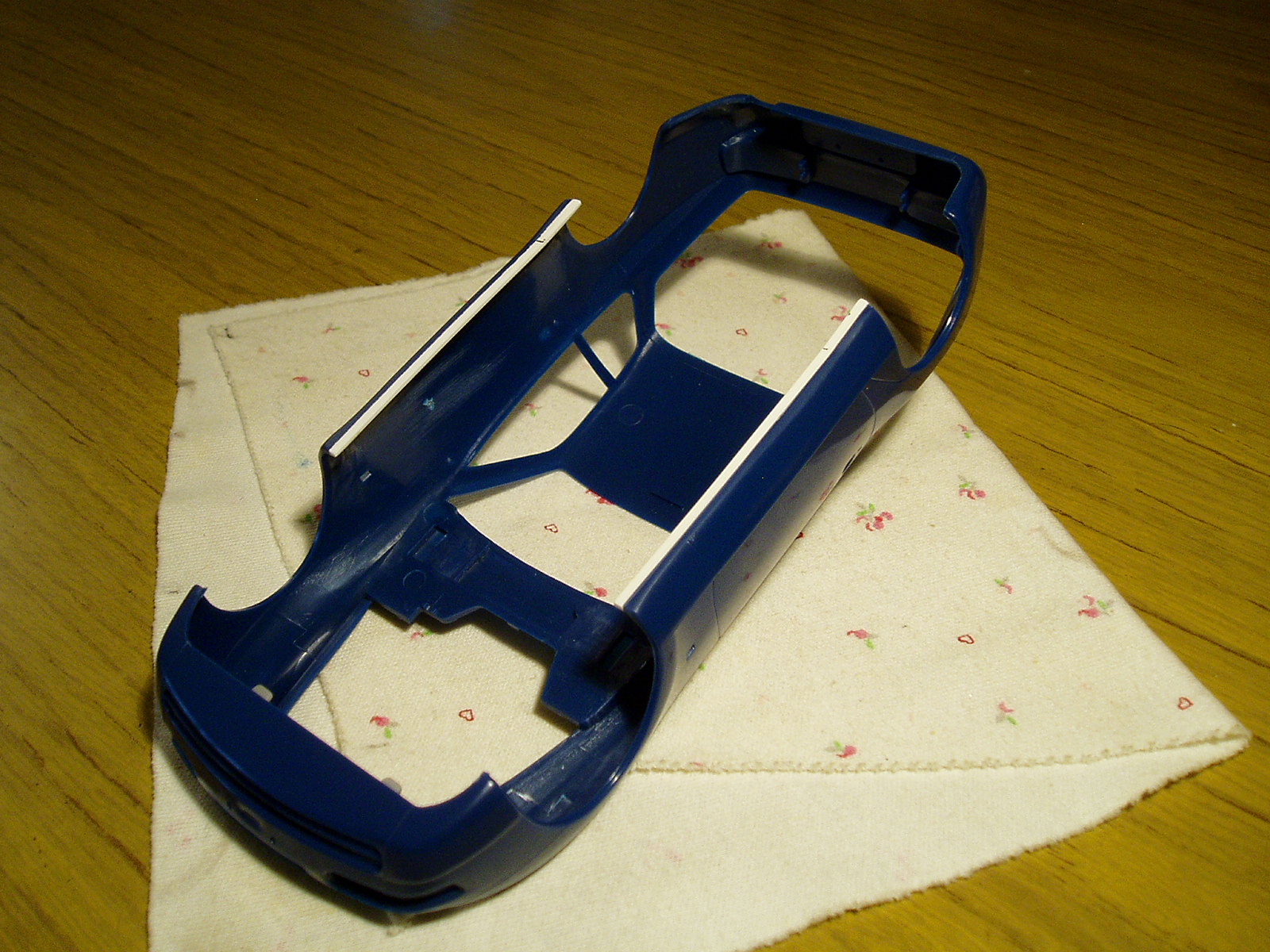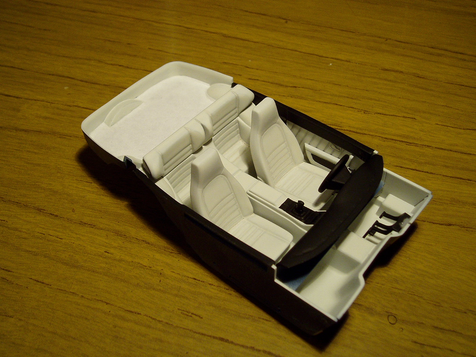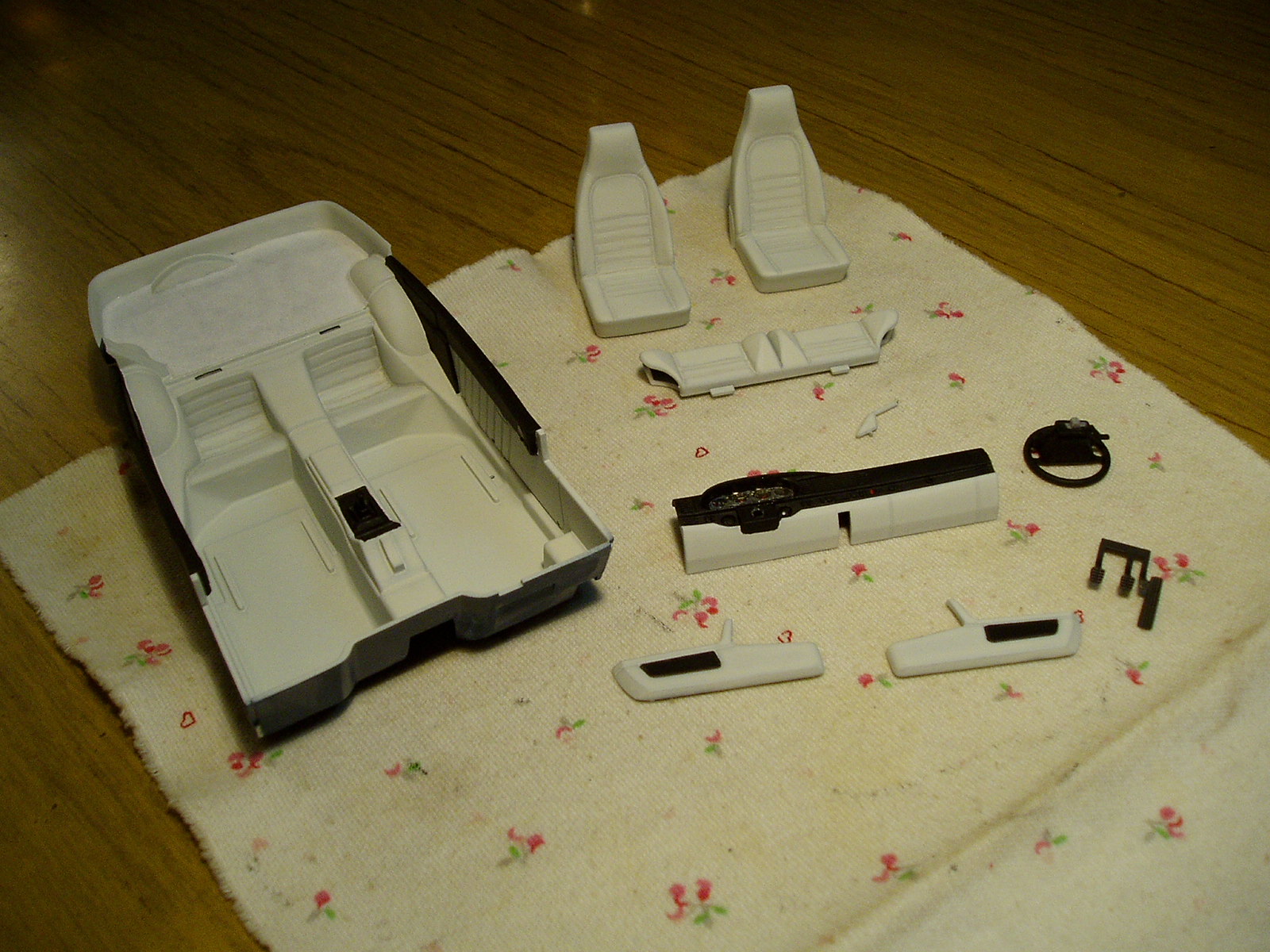 Por ello continuamos con el interior, con felpina blanca hago la alfombrilla del baul Pintamos todo con un gris claro enamel de Tamiya y luego aplico acrilico Blanco Antiguo de EQ y detallo con acrilico Negro de Eterna Ensamblamos todo y pegamos al chasis Y procedemos a cerrar el kit, donde me encuentro que el block motor toca con la carroceria dando mucha batalla para hacerlo pero salgo ileso de esa situacion con algunos raspones en la parte interna de la carroceria donde habra que retocar Ahora quedan los detalles externos