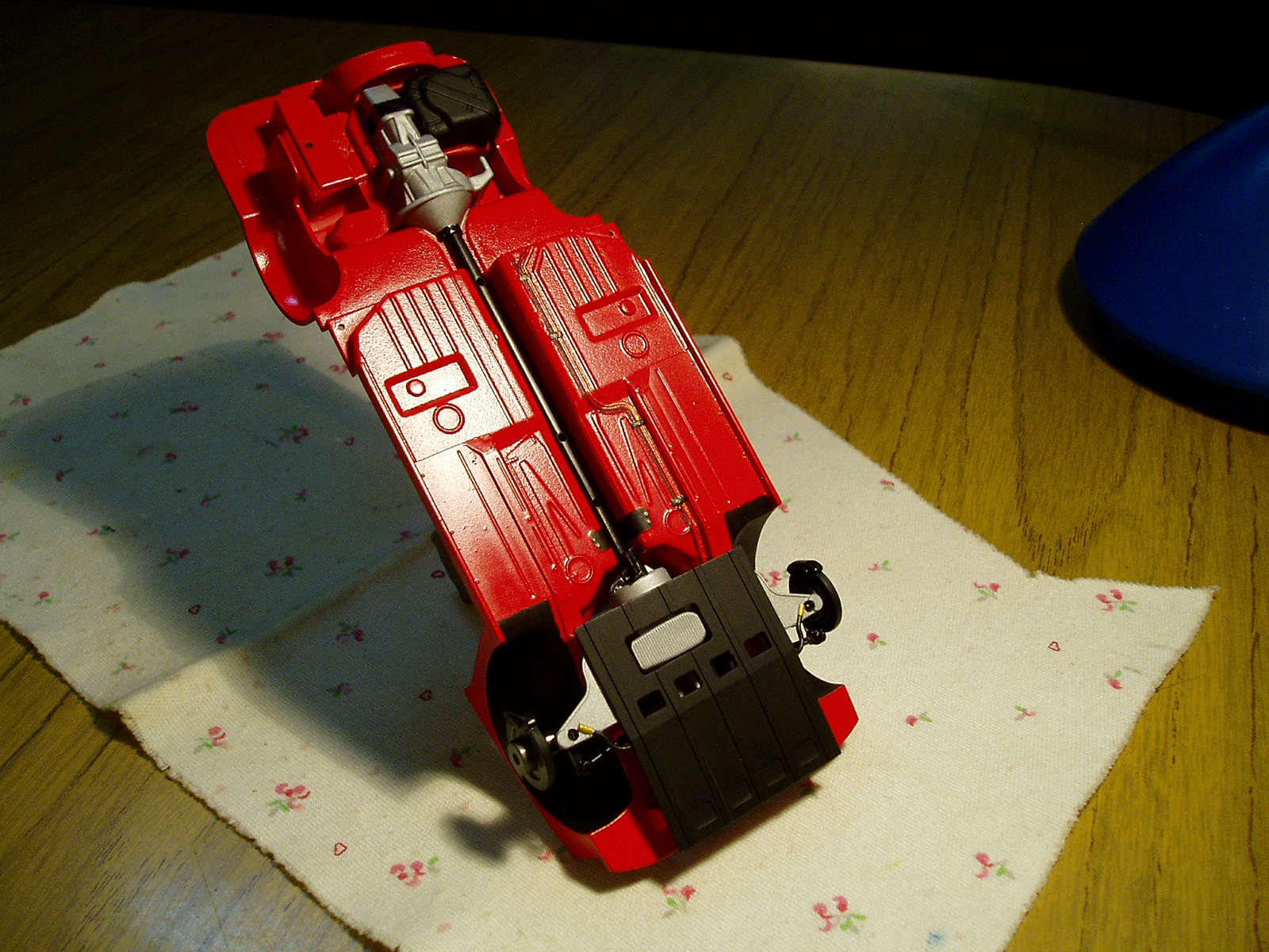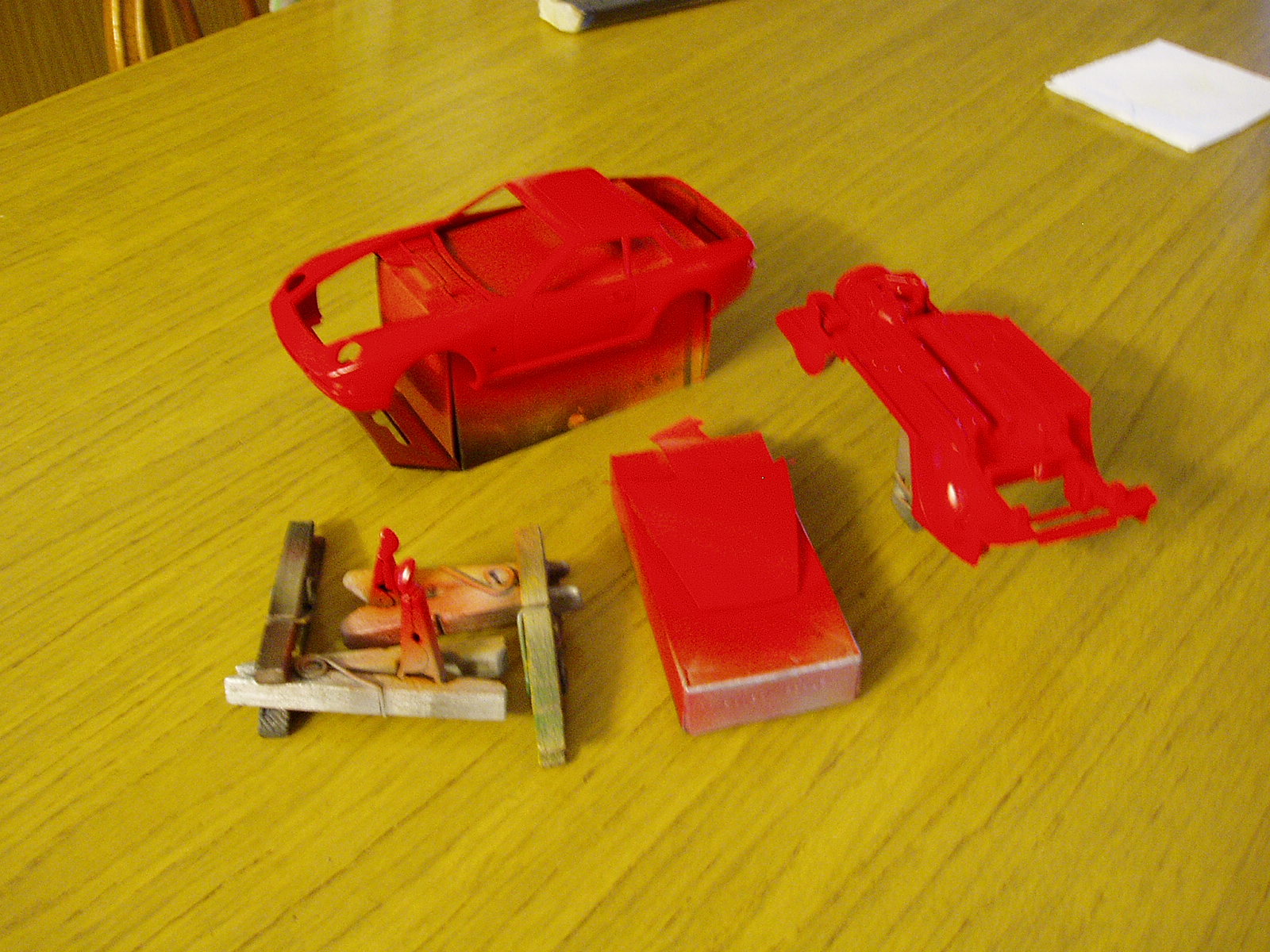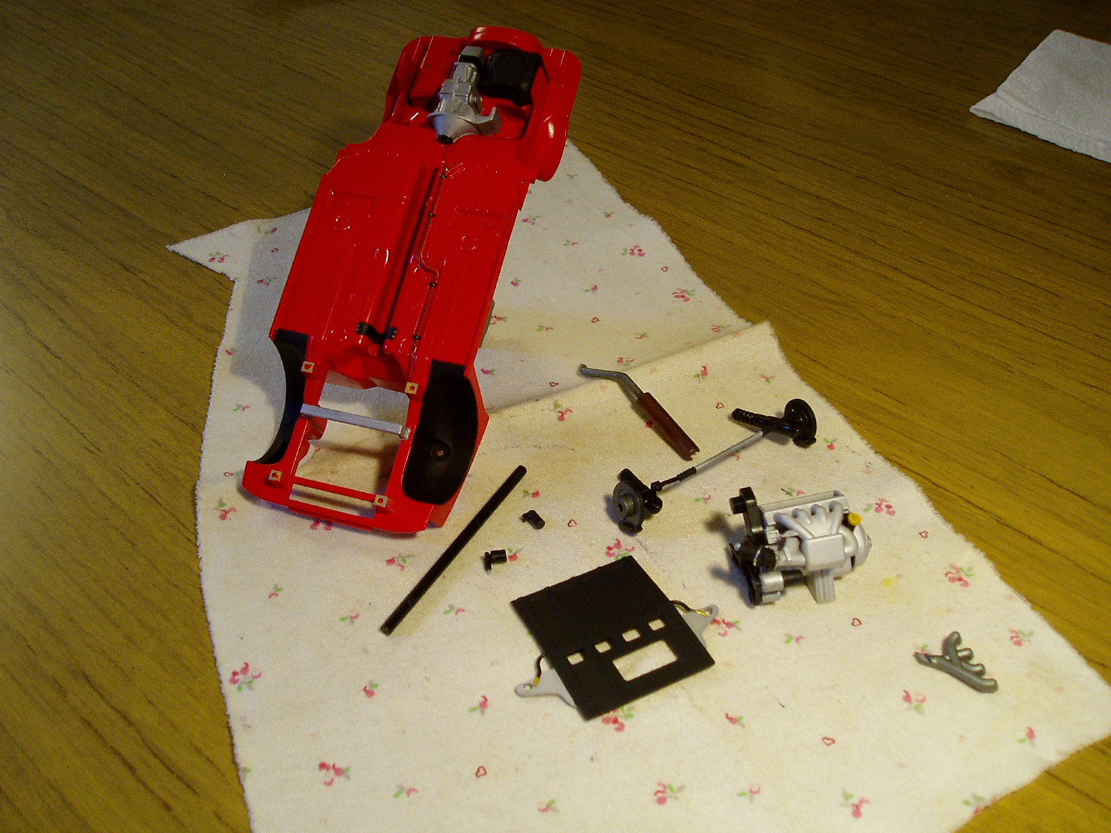 El boxart el contenido y empezamos, quitar cromado del block motor, rehacer la coneccion con el filtro de aire y darle textura a la goma del ducto de aspiracion quitar recipiente izquierdo que no va y como era de suponer, hacer un firewall Pasamos a la carroceria, quitando luz entre chasis y esta corregimos rechupes y asimetrias Usamos Humbrol amarillo insignia como primer y pintamos con acrilico Bermellon de Eterna dando luego Barniz gral Eterna