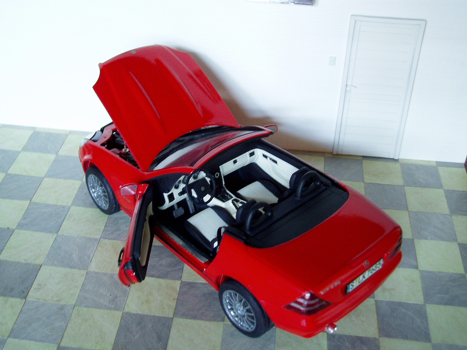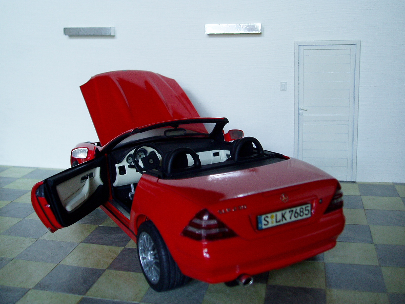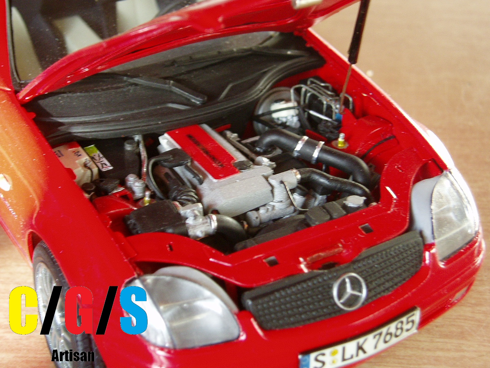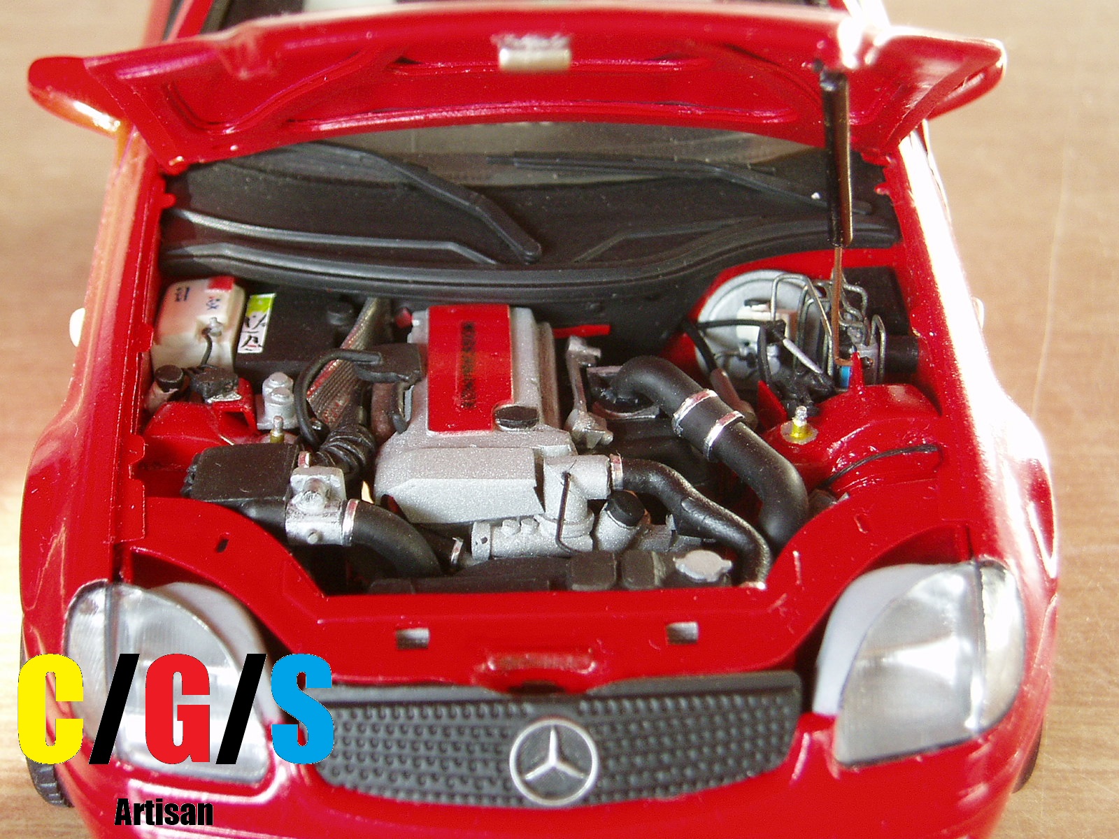 este es el segundo SLK con mucho mas detalle que el primero ya que me deje llevar por mis gustos y termino con un motor mas detallado de lo que pretendia, y ademas me tome el trabajo de cortarle la puerta del conductor para ver como se me da esa parte (me quede con las ganas de cortarle la otra y el techo). El color fue algo que me tenia indefinido, entre azul oscuro y rojo, pero una fotografia de un AMG lo definio, rojo. El interior estaba entre todo negro y una combinacion de dos tonos, resulto esta ultima con un color Manteca y negro. A los relojes le puse su correspondiente vidrio hecho de acetato, las luces traseras las modifique para que tengan profundidad y no se vea como una lamina plateada, las luces delanteras las pinte con el cromo de Tek Bond que me gusto mucho como funciona y como era de esperar tanta dicha tenia que tener algun problema, el barniz nuevo que compre hace agujeros en la pelicula, por suerte me quedaba bastante del viejo y pude solventar el desastre.