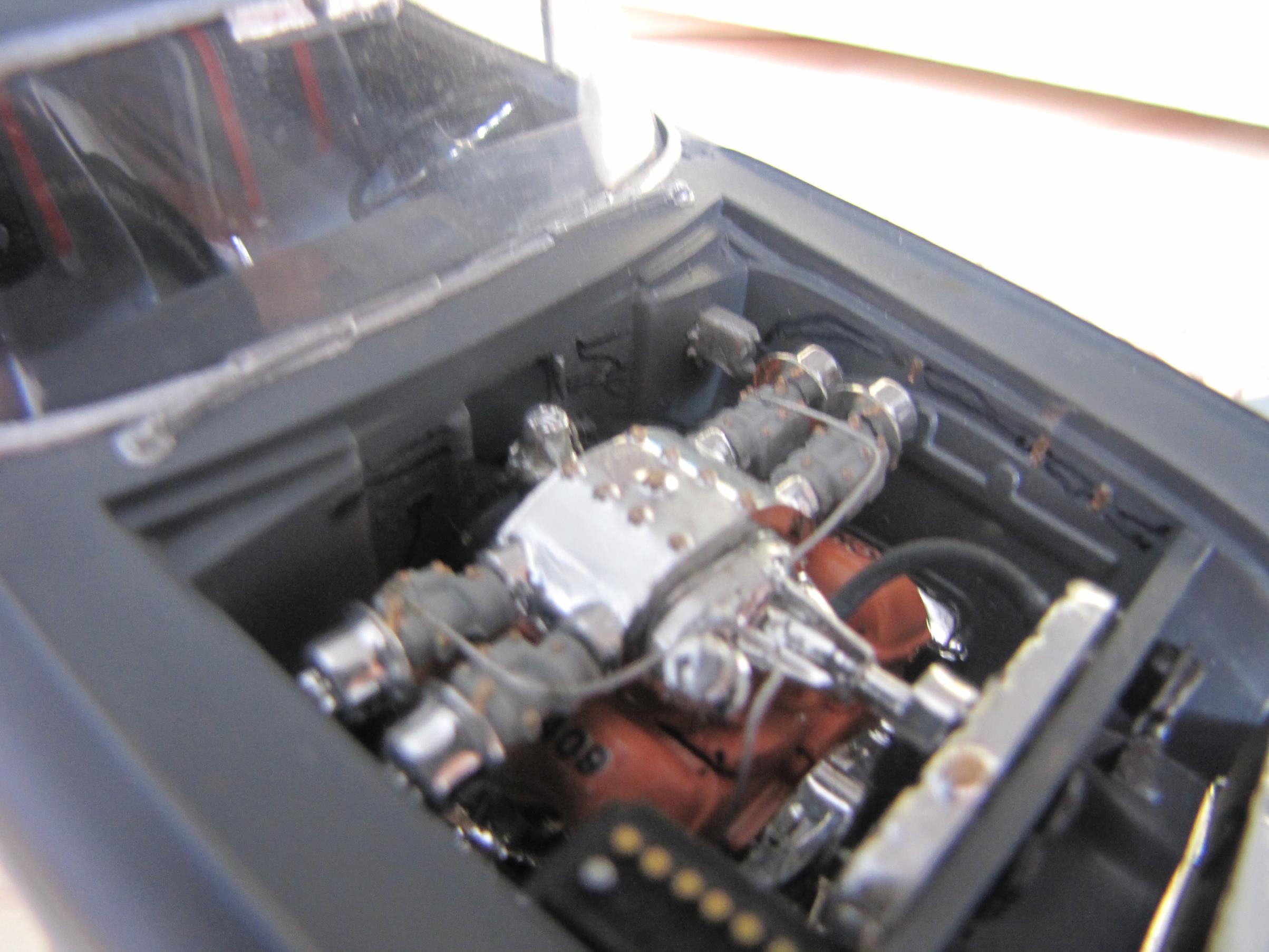 El motor de la maqueta es el Chevrolet 409-C.I. es el motor de carreras por excelencia de Chevrolet a principio de los 60'. con un gordo Compresor-Volumetrico y alimentado por 4 caburadores en forma de "Boxers".