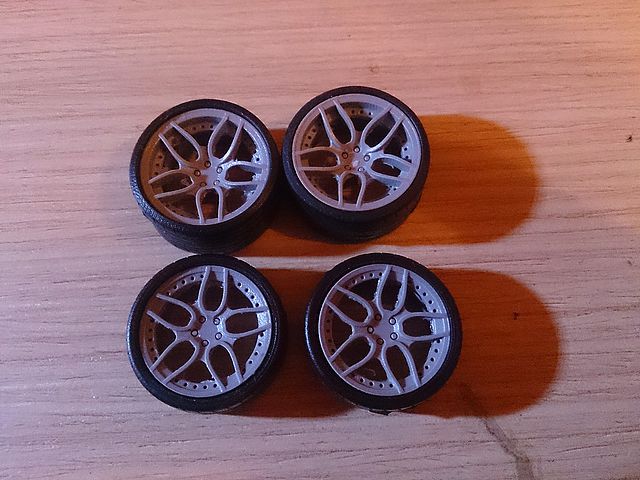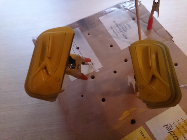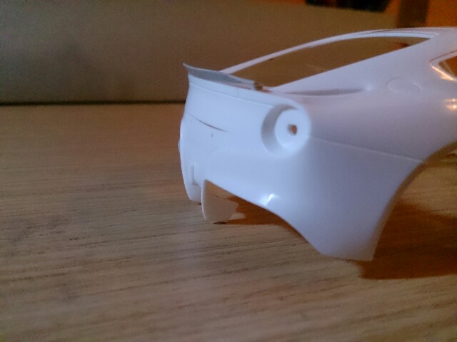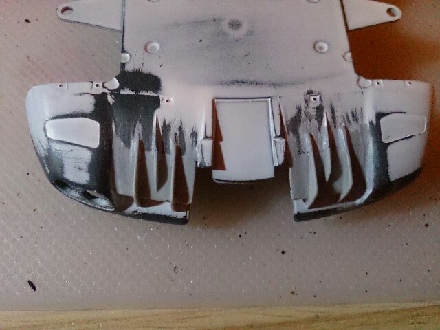 - Aqui como veis, le he puestos los difusores, los de serie tenían solo una aleta, este lleva dos mas, lo que he tenido que masillar las juntas y las aletas porque no quedaba del todo bien emcajado, asi que masilla y lija y listo.. Volvere a imprimar por si hay algun fallo y pintar en negro y fibra de carbono..
