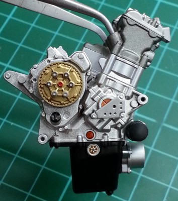 El motor pintado, con detalle de la abrazadera del filtro de aceite.
