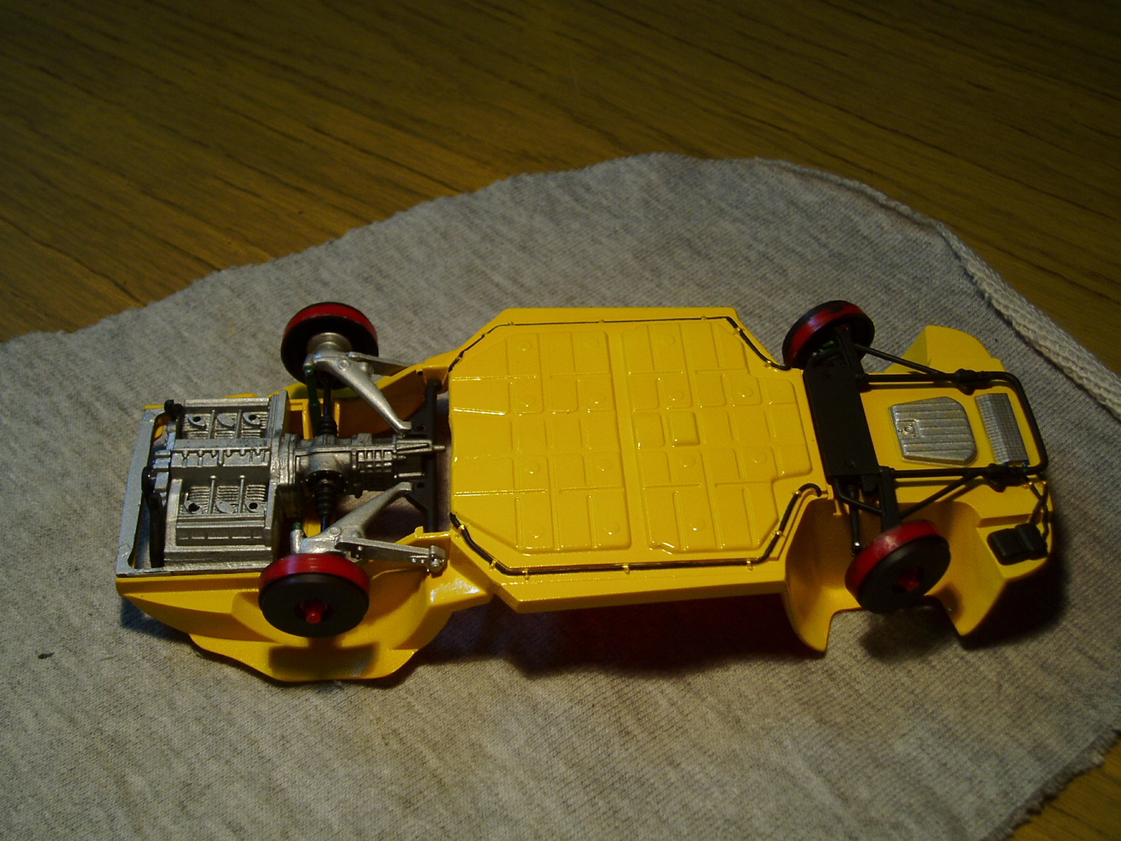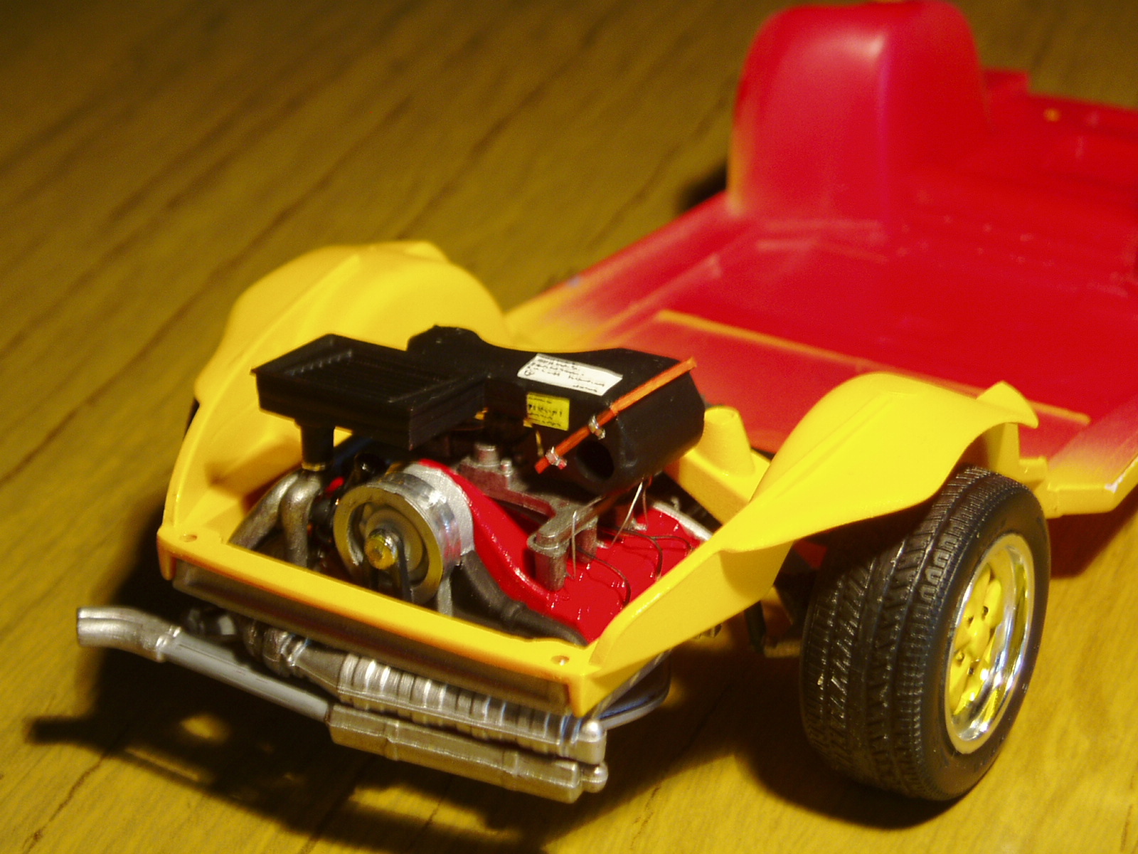 Recortando el tren delantero ha logrado que el mismo tenga direccion; detallando algunas partes de los bajos y el motor