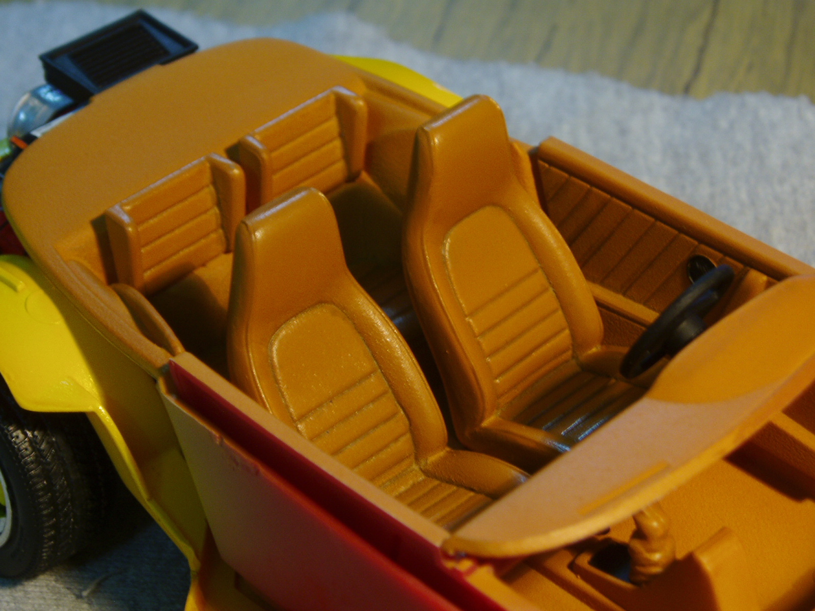 Tambien estuve haciendo unos lavados en el interior, sobre los asientos y en los paneles de puerta, con siena mezclado con negro, luego les di una mano de barniz satinado a los asientos