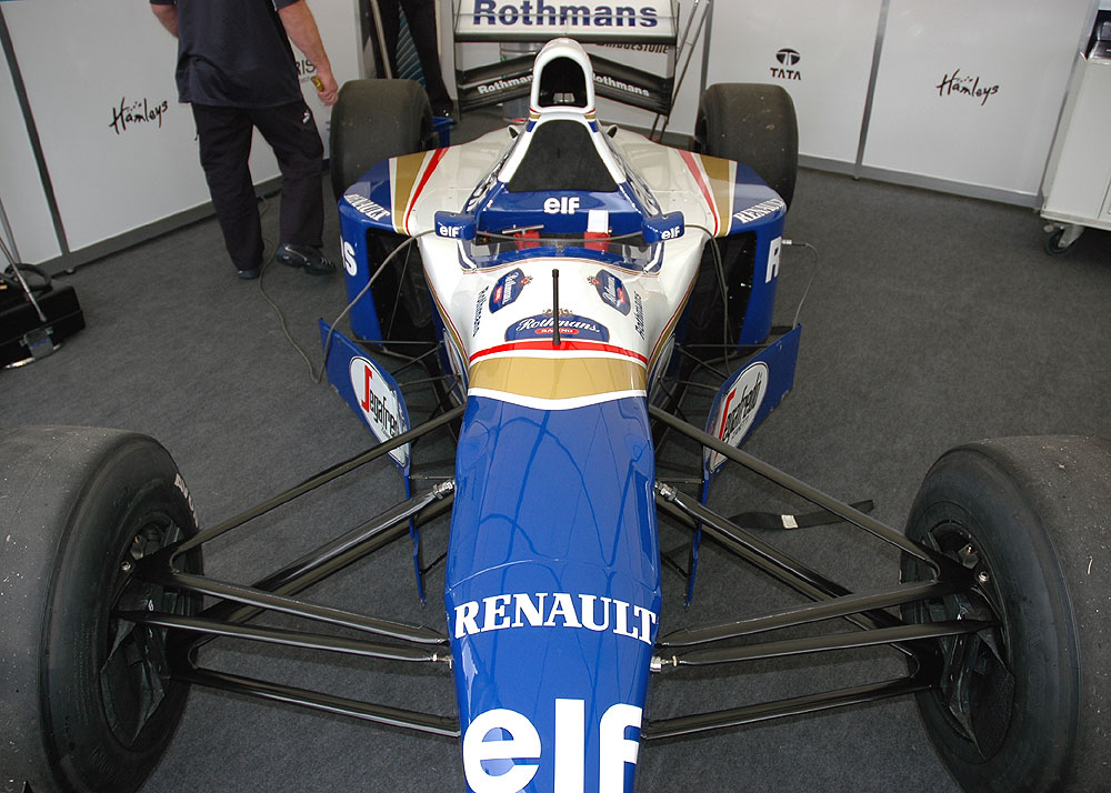 Estoy buscando alguna foto del Williams FW16 de 1994 de Ayrton Senna para una ilustración, pero necesito que sea de tamaño más o menos grande y en una posición muy determinada: lo necesito que se vea en posición totalmente frontal y con una perspectiva ligeramente elevada, más o menos en esta posición, pero mucho más grande claro, que se aprecien bien los detalles...