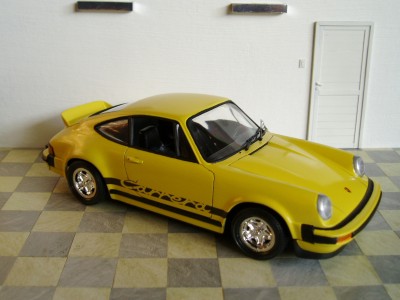 un kit viejuno de Revell copia de Monogram por lo que decia en el plastico el cual no representaba lo que la caja decia Porsche Carrera RSR, asi que me decidi por hacer un Porsche 911 Carrera MFI Ducktail (cola de pato), por suerte traia varias piezas que no tuve que rehacer en epoxi como los parachoques, si toco hacer el aleron trasero y rehacer el interior (butacas); el color es un amarillo blanquecino (acrilico color Maiz de Eterna) y las calcas son caseras, tambien toco rehacer el sistema de escapes. Muy satisfecho con el resultado final y lo he pasado de 10.
