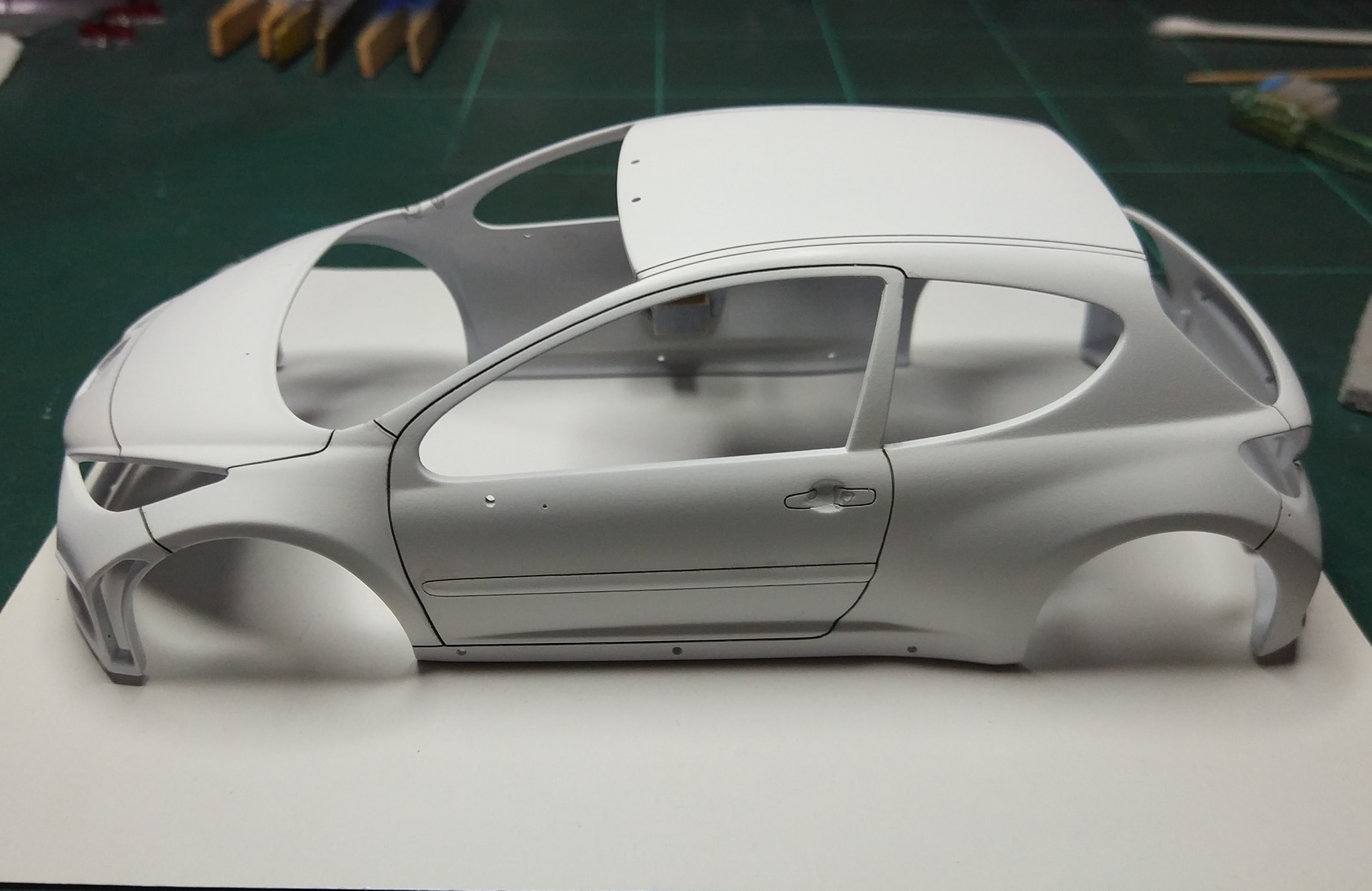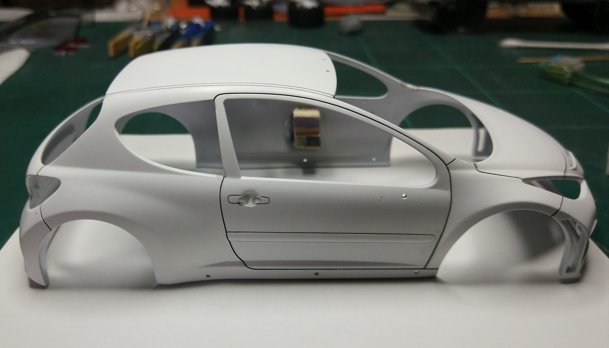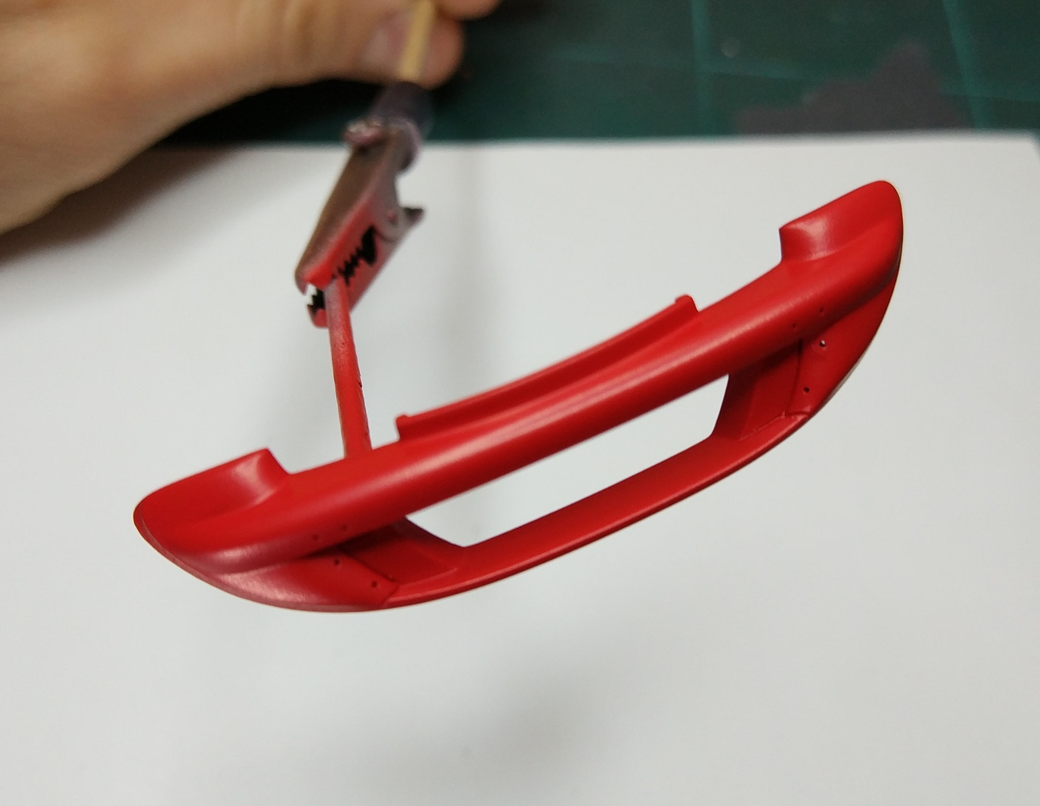 He probado el red cherry y he pintado en blanco la carrocería. También le he dado el panelado y lijado toda la carrocería.